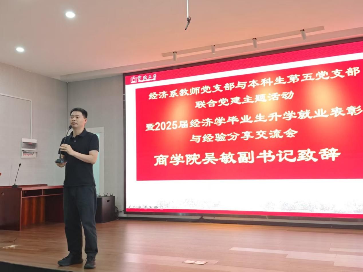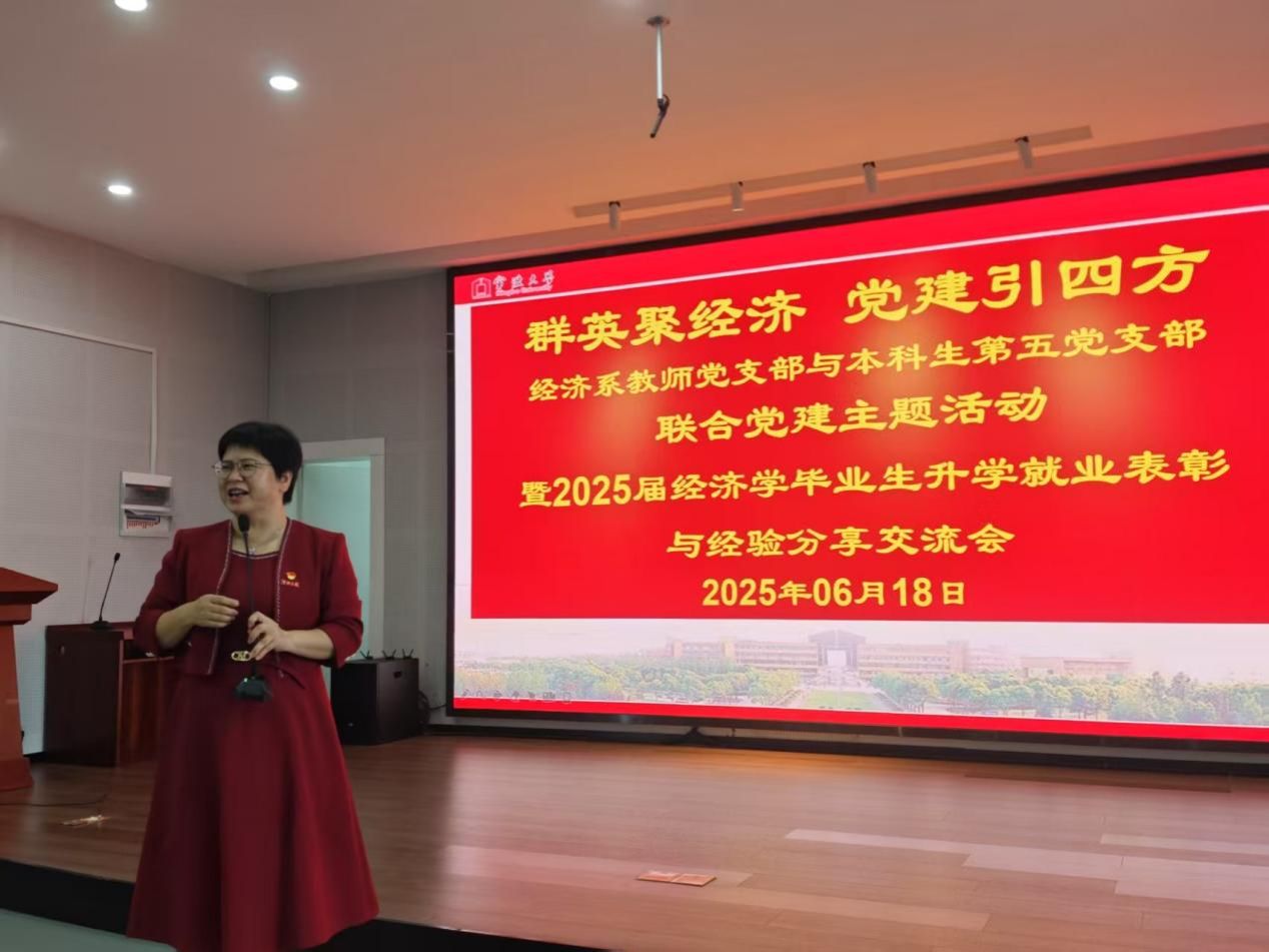 6月18日下午, 91沈先生 501报告厅举行“2025届毕业生升学就业表彰与经验分享交流会”,本次会议由经济系教师党支部与本科生第五党支部共同举办,旨在表彰在升学就业方面取得优异成绩的毕业生,并搭建经验交流平台,助力低年级学生明确发展方向,规划未来。会议由经济系教师党支部书记、系主任徐群芳主持, 91沈先生 党委副书记吴敏受邀参加,经济系教师、2025届经济学毕业班学生以及22级和23级经济学专业学生共同参与本次活动。