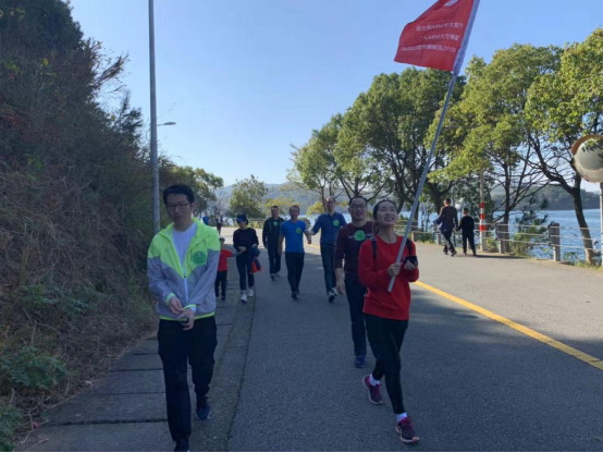 陈涛副院长希望在登山过程中,大家团结一致,互帮互助,并宣布主题登山活动正式开始。上午九点半,运动员们一齐从九龙山庄出发,进入景区,途径湖滨路,循登山步道而攀。山途设有地标为运动员们引导正确的方向,也有志愿者驻岗的补给站输送能量。