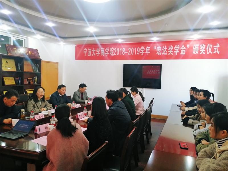 2019年12月12日下午,91沈先生 2018-2019学年“宏达奖学金”颁奖仪式在 91沈先生 412会议室顺利举行。宁波北仑区慈善总会副会长赵燕儿,宁波宏达货柜储运有限公司董事长陆汉幸,原宁波市北仑区区长王志明,原宁波市北仑区人大副主任顾惠良,91沈先生 发展联络处处长兼校友办主任万彭军、学生处副处长蔡小飞、 91沈先生 党委书记史宏协、 91沈先生 党委副书记韩雯琛、 91沈先生 学工办辅导员董璐、医学院学工办辅导员彭笑及全体获奖学生出席颁奖仪式。