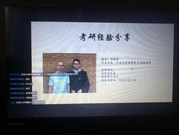 经济学作为经济类学科的基础专业,读研一直是学生的重要选择。在学院的支持和关怀下,经济系逐步建立起了考研留学指导制度,并于2019年底专门成立了经济学会学生社团,通过不定期活动分享考研信息和经验,激发学生考研和留学的兴趣。在学院和经济系老师的大力支持下以及班主任闭明雄老师和经济学会指导老师的共同努力下,今年的升学工作取得了喜人的成绩。2020届经济学专业毕业生36名,其中国内读研6人,出国留学5人,升学率达到31%,创历史新高。在毕业生即将离校之际,经济学会于6月26日下午组织了一场升学经验交流会,分别由2020届本专业毕业生中成功考研和出国留学的优秀学生向2017级和2018级有志升学的学弟学妹们分享奋斗的经验。本次交流会由经济学会负责人、2017级经济学专业班主任于冰主持,经济系教学系主任黄晖和2016级班主任闭明雄全力协调。由于正值毕业生离校之际,又是端午假期,本次交流会采取灵活的钉钉直播的方式开展。为了使同学们能熟练运用钉钉直播,于冰老师花费了大量的时间给学生一对一地指导,从而确保了交流会顺利地进行。