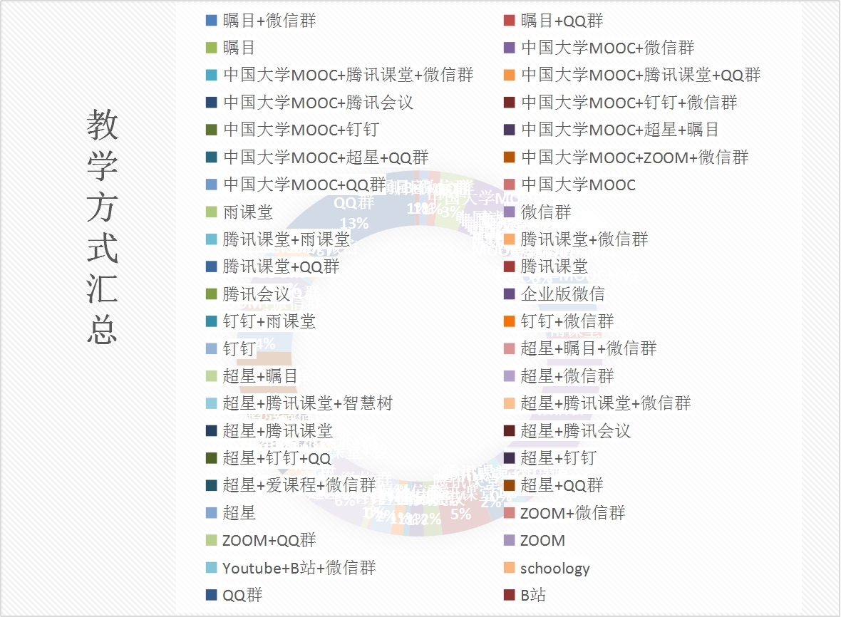 从一周老师上课情况看,不少老师采用多种手段进行混合式教学,利用各在线教学平台+各直播软件,有的老师甚至同一堂课引进两个教学平台上的优质教学资源指导学生学习,更好的提高了线上教学质量,让同学们从中获益。经汇总统计,91沈先生 老师采用两种平台或软件混合教学的课程有159门次,占了总开课课程数的42.4%,采用三种平台或软件混合教学的课程有23门,占比为6.1%。