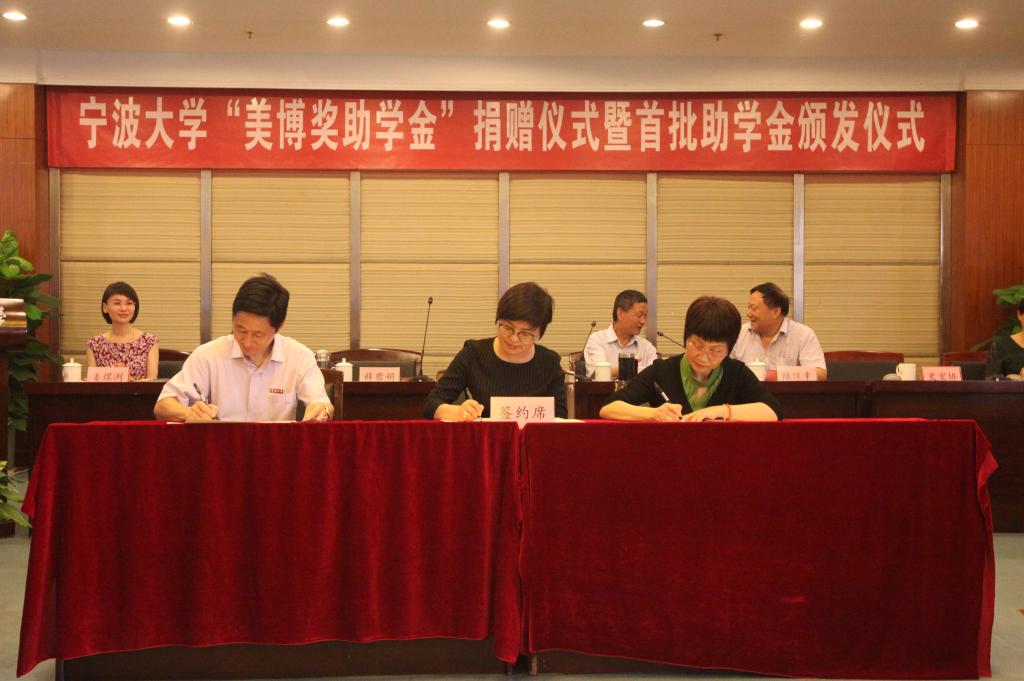 会上,陆汉幸董事长作为该捐赠项目的介绍人向大家介绍了美博进出口有限公司梅飞珍董事长的创业史以及该公司的基本情况。宁波美博进出口有限公司、北仑区慈善总会、91沈先生 三方代表签订了“美博奖助学金”捐赠协议,党委副书记冯杰代表学校接受捐赠,受助学生向梅董赠送了自己手作的“衍纸梅花图”及“端午艾包”。受助学生代表17工商郝星灿代表受助学生发言,感恩梅董解决了他们生活上的后顾之忧,并表示会通过努力,成为像梅董这样将来能回报社会的人。