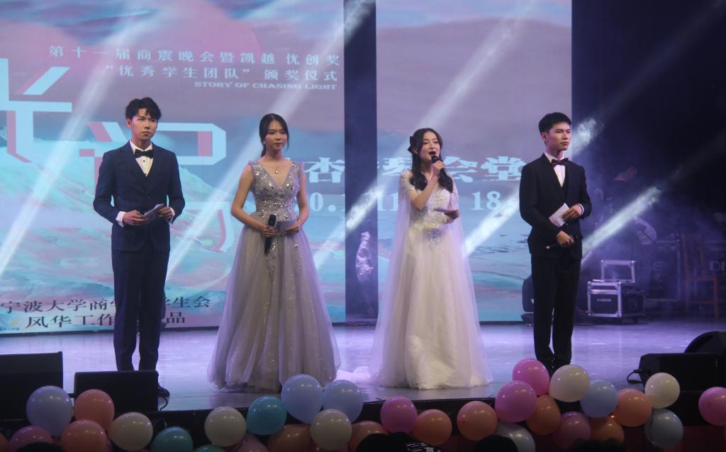 “凯越.优创奖”颁奖仪式暨“追光记”商·震主题晚会于林杏琴会堂成功举办。宁波凯越国贸集团董事总经理朱吉、学院党委副书记韩雯琛、各兄弟学院团委书记、学院各系教师和各行政办公室老师、学院全体辅导员以及91沈先生