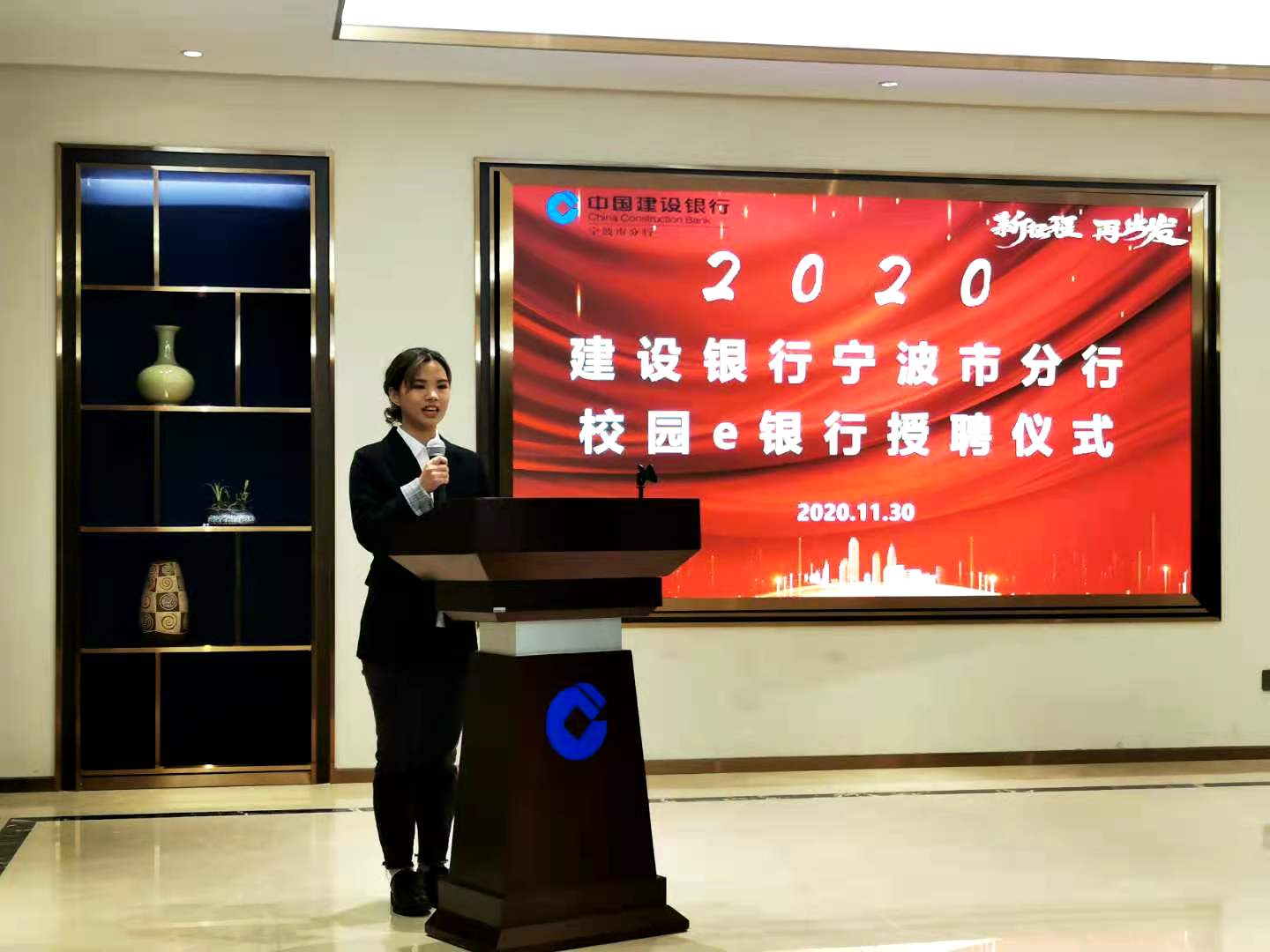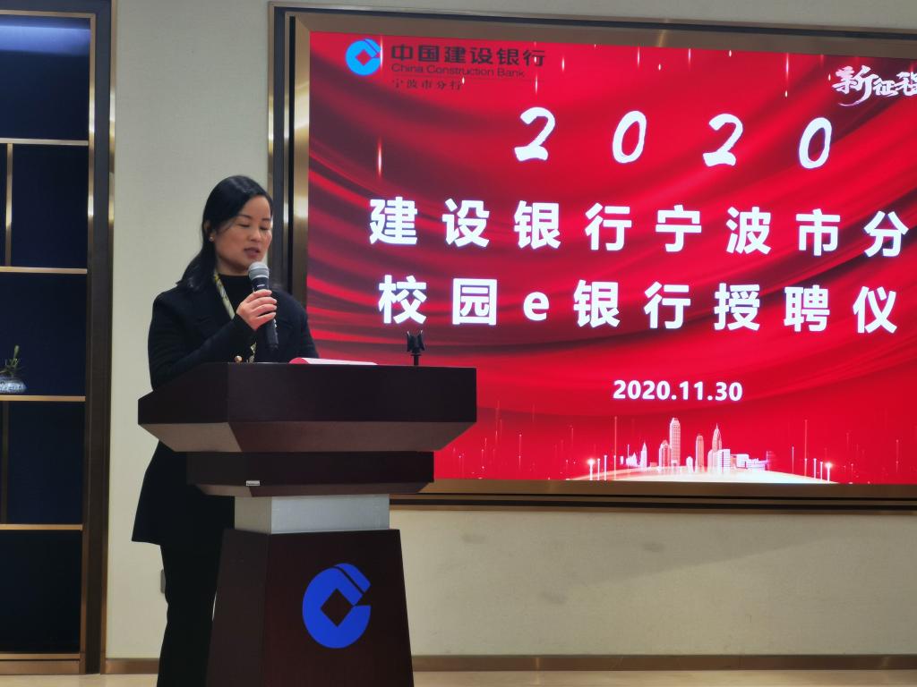 11月30日下午,建设银行宁波市分行校园e银行授聘仪式在中国建设银行宁波分行371多功能厅圆满落幕,本次仪式沿用了授聘仪式与金融宣讲相结合的形式。建设银行宁波市分行个人金融部副总经理孙武、分行营业部副总经理楼建波,91沈先生 党委副书记韩雯琛、团委副书记章舒怡,浙江万里学院学工部部长林德操、副部长吴章健等领导和嘉宾出席本次授聘仪式。