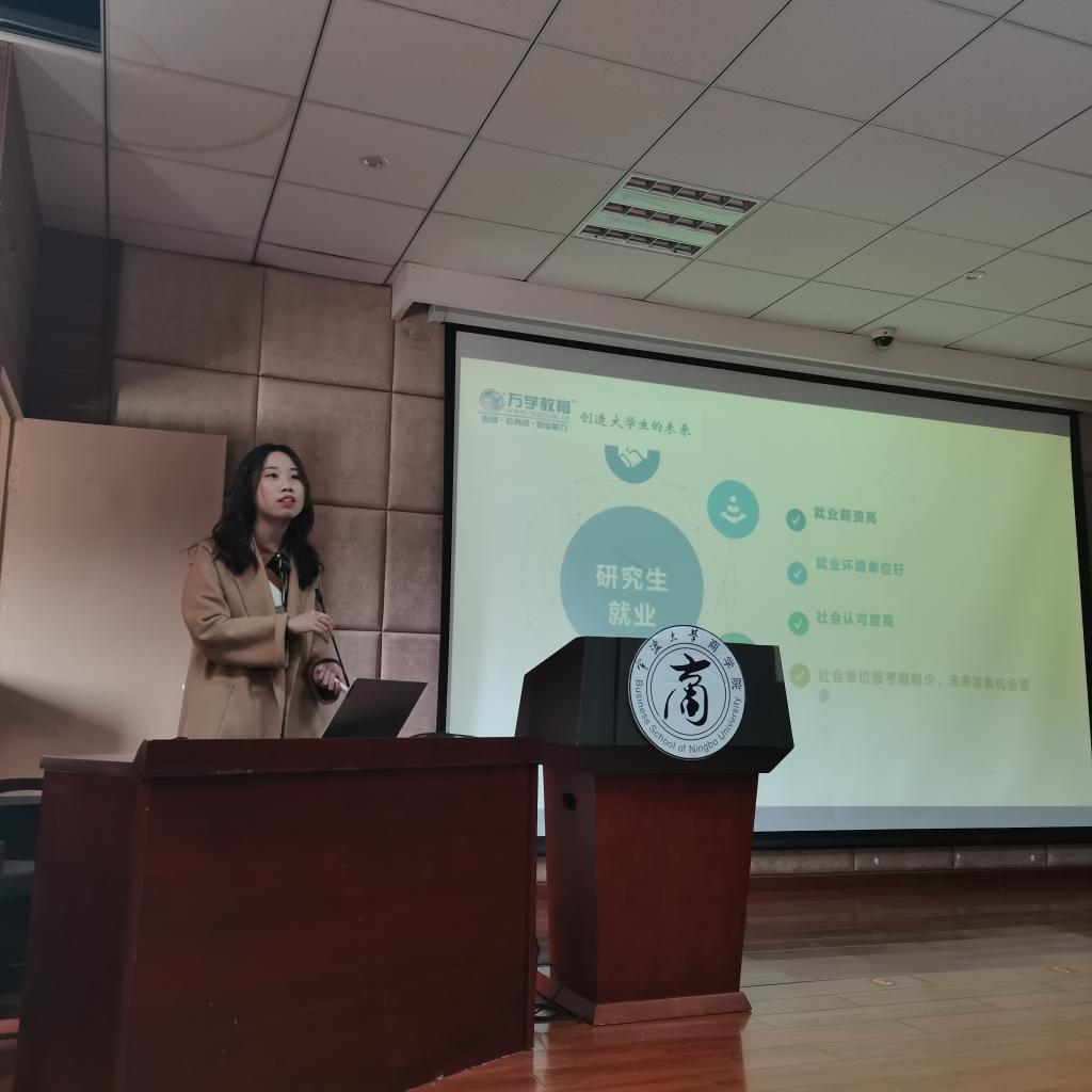 讲座伊始,91沈先生 辅导员龚昆朋为同学们介绍了学院的考研情况以及本场讲座的重点,极大地调动了同学们的热情。随后,胡善盼基于自己多年来的考研辅导经验,结合当下学生最关心和困惑的问题,如院校和专业选择、各科复习重点、辅导资料使用、各科时间规划、考研关键环节等,做出了专业详细的解答。最后,她对部分同学的问题进行了一对一解答,同时建立了专门的微信交流群,后期提供一对一个性化咨询。