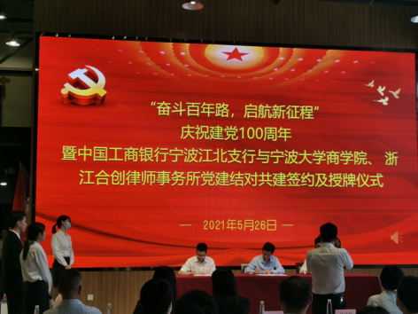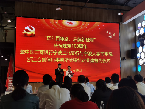 为庆祝中国共产党成立100周年,进一步加强基层党组织建设,探索党建共建新模式,构建银校企党建结对共建新格局。5月26日,91沈先生 与中国工商银行宁波江北支行、浙江合创律师事务所在宁波文化创新港人才之家共同举办“奋斗百年路,启航新征程”党建共建结对活动。院党委书记史宏协、院党委副书记韩雯琛、江北区司法局局长林幼红、江北区司法局副局长欧金铨、工商银行宁波江北支行党委书记童晓松、浙江合创律师事务所党总支书记邓旭东及三方共建单位党员同志共同参加。会上,共建三方举行了党建共建签约授牌仪式,同时开展了红色主题教育活动。