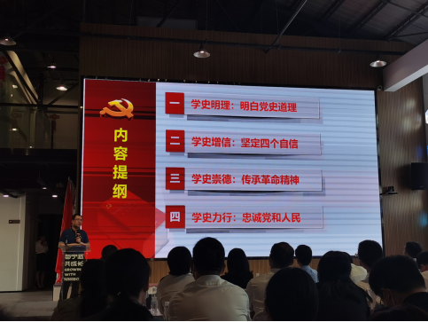 活动第三个环节为党史学习教育专题讲座,由宁波市委党校党史党建教研部副教授齐峰作题为《从百年党史不凡历程中感悟真理和力量》的专题讲座。他从学习党史的历史意义、现实意义为切入点,分别阐释了“学史明理”、“学史增信”、“学史崇德”、“学史力行”,以及具体该如何落到实处,最后希望在场各位以史为鉴,学习中国共产党从苦难走向辉煌的历程中,矢志不移的信念和艰苦卓绝的精神。