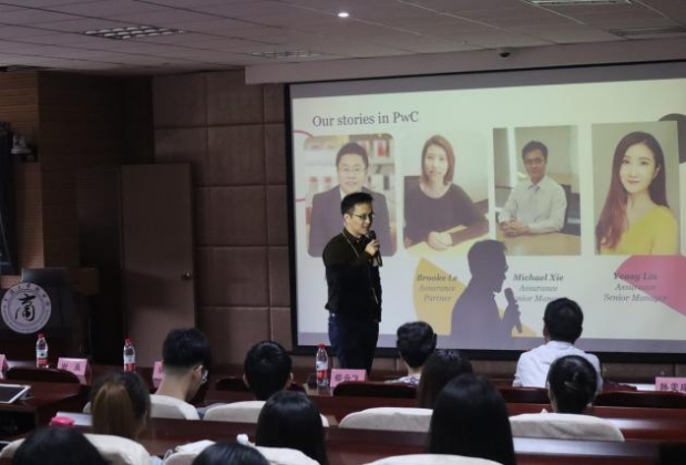 随后,邵云飞、乐乐、谢盈以及刘易先后讲述了自己加入以及留在普华永道的原因,同时分享了在从事审计行业时的心得体会。合伙人乐乐向同学们详细说明了公司在招聘员工方面的要求与希望,强调了学习能力、沟通能力以及抗压能力的重要性,她还说到公司注重对员工价值的肯定和关心,内部氛围和谐融洽。