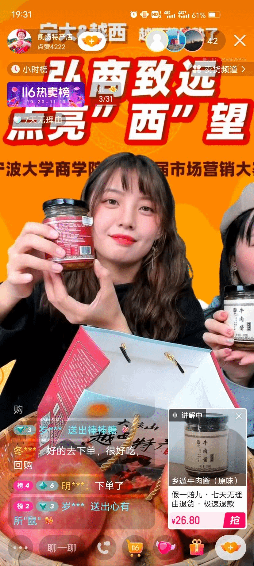 让青年发声、让青年发力,让青年共同聚焦东西部协作,脱贫攻坚的社会热点问题上,在市场营销大赛的赛场上,发出新时代青年助力社会发展的声音与力量。本次大赛由宁大 91沈先生 党委、江北区团委和江北区商务局主办,宁大 91沈先生 团委、学生会承办。短短的一个月,我们共组织25支队伍报名,最终12支队伍参加了线上直播展卖环节,掀起全域行动、全民参与对口帮扶工作的热潮。