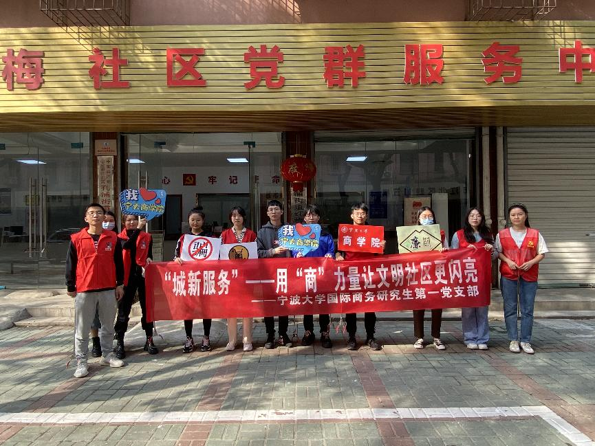 为鼓励学生党员积极加入文明城市创建工作,以实际行动弘扬志愿者服务精神,提升城市“文明指数”,为宁波市创建文明城市贡献力量。10月26日,91沈先生 国际商务专业研究生第一党支部在孔浦社区开展了“城新服务”——用“商”力量让文明社区更闪亮活动。