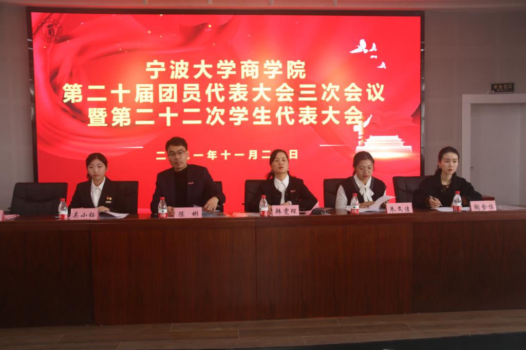 11月20日,91沈先生 第二十届团员代表大会三次会议暨第二十二次学生代表大会在曹光彪商科楼5楼报告厅隆重召开。校学生会主席团成员、91沈先生 党委副书记兼纪委书记韩雯琛、学工办主任兼团委书记陈彬、团委副书记研究生出秘书组长朱文洁、团委副书记陶含怡,以及各兄弟学院的团学代表出席本次大会。来自学院48个代表团共计101名学生代表和66名第二十届团委、学联会委员候选人及各团学组织干部候选人参与本次大会。