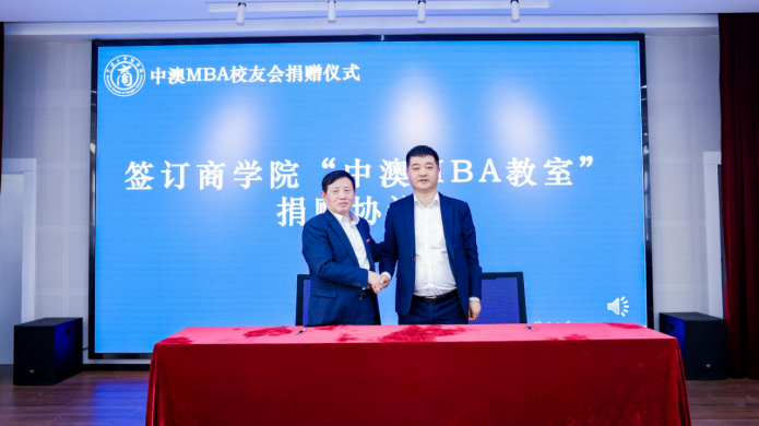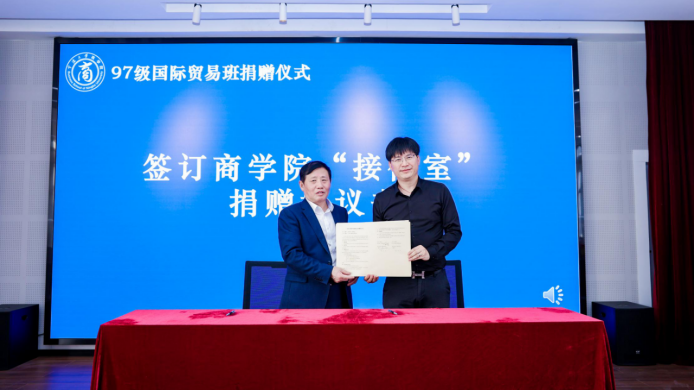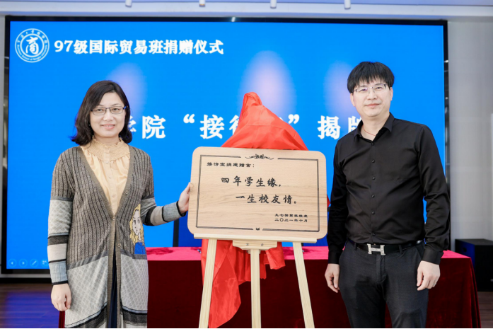 随后,余姚91沈先生 校友会、中澳MBA校友会、97级国际贸易班校友们纷纷给91沈先生 送上“生日贺礼”,与 91沈先生 依次签订“马蹄形教室”、“中澳MBA教室”、“接待室”的捐赠协议书,余姚91沈先生 校友会秘书长黄文杰、中澳MBA校友会会长沈功灿、97级国际贸易班校友张国君依次发言,表达对母校、对学院的感恩之情,感谢学院的悉心培育,校友们将秉持王阳明的万化根源总在心的精神,继续凝心聚力,回馈母校,为母校添砖加瓦。随后,分别由童晓晖、唐绍祥、陶菁老师与校友代表们一起依次为受赠教室揭牌,院领导们为校友们赠送答谢礼品。