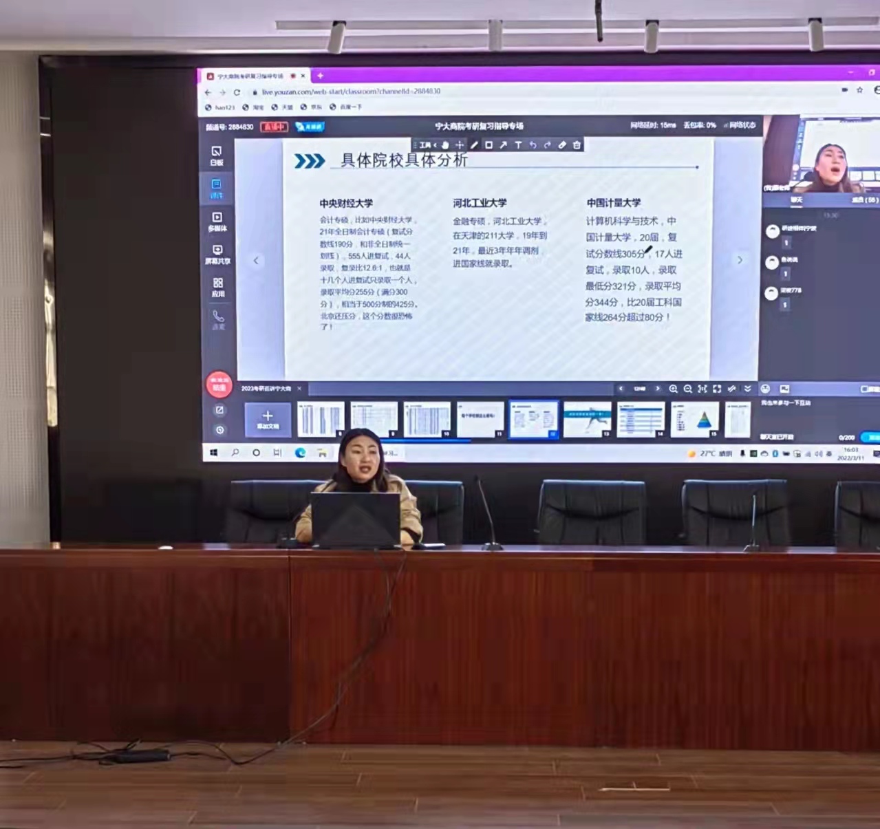 开始之初,顾慧敏从考研关键时间节点出发,给同学们详细讲解了考研主要流程和节点任务。随后,她重点解读了各科全年复习规划,提醒同学们要合理分配复习时间,掌握科学的复习备考方法,并向同学们分享相关复习资料。最后,顾慧敏和同学们进行了互动,解答了同学们的疑惑。顾慧敏以幽默的语言结合实际案例,让听讲的同学们收获良多。