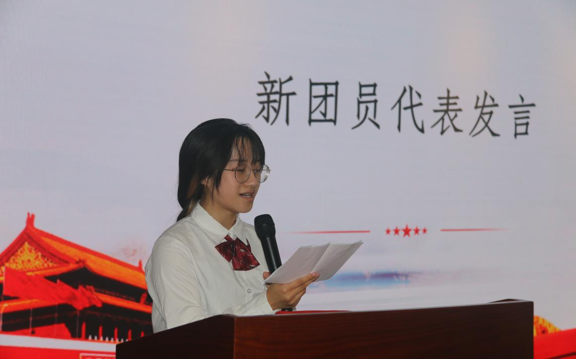 活动伊始,主持人带领大家举行了新团员的入团仪式。章舒怡说明举行入团仪式的意义,并宣读了新团员名单,为新团员佩戴团徽。学生团副俞晨慧作为老团员代表带领新团员做了入团宣誓。接着程熠榕同学作为新团员代表发言,她说:“在五四青年节当天作为新团员代表站在这里发言,我感到非常荣幸。加入中国共青团,不仅代表着一种荣誉,更代表着一份责任。今后,我会不断提高自己的思想觉悟,用实际行动践行我的入团初心。”