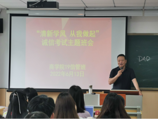 本学期课程已接近尾声,期末考试也如期而至,6月13日上午,91沈先生 19级信管班全体学生在包氏教学楼6号楼106室举办诚信考试主题班会,会议由班长卢静芝主持,由副院长陈涛、班主任王昕天主讲。此次主题班会的举办,目的在于关心了解学生现状,同时积极树立诚实考试、诚信做人的作风,增强学生诚信意识,彰显新时代大学生良好的思想道德精神风貌。