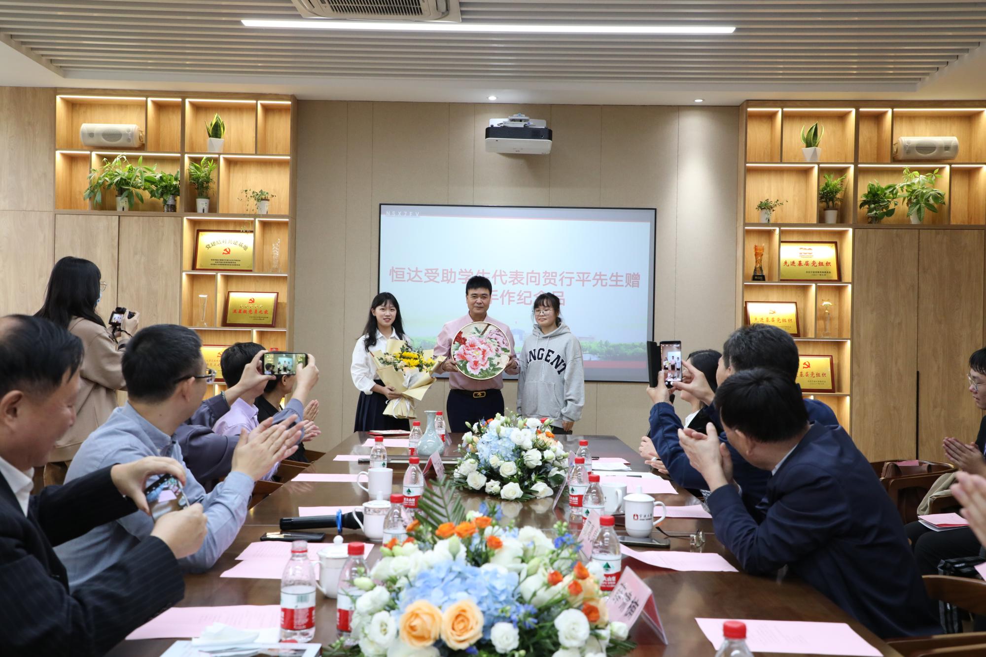 蔡小飞副处长宣读首批“恒达奖助学金”受助学生名单,并由贺行平先生给恒达受助学生颁发2022年“恒达助学金”证书。