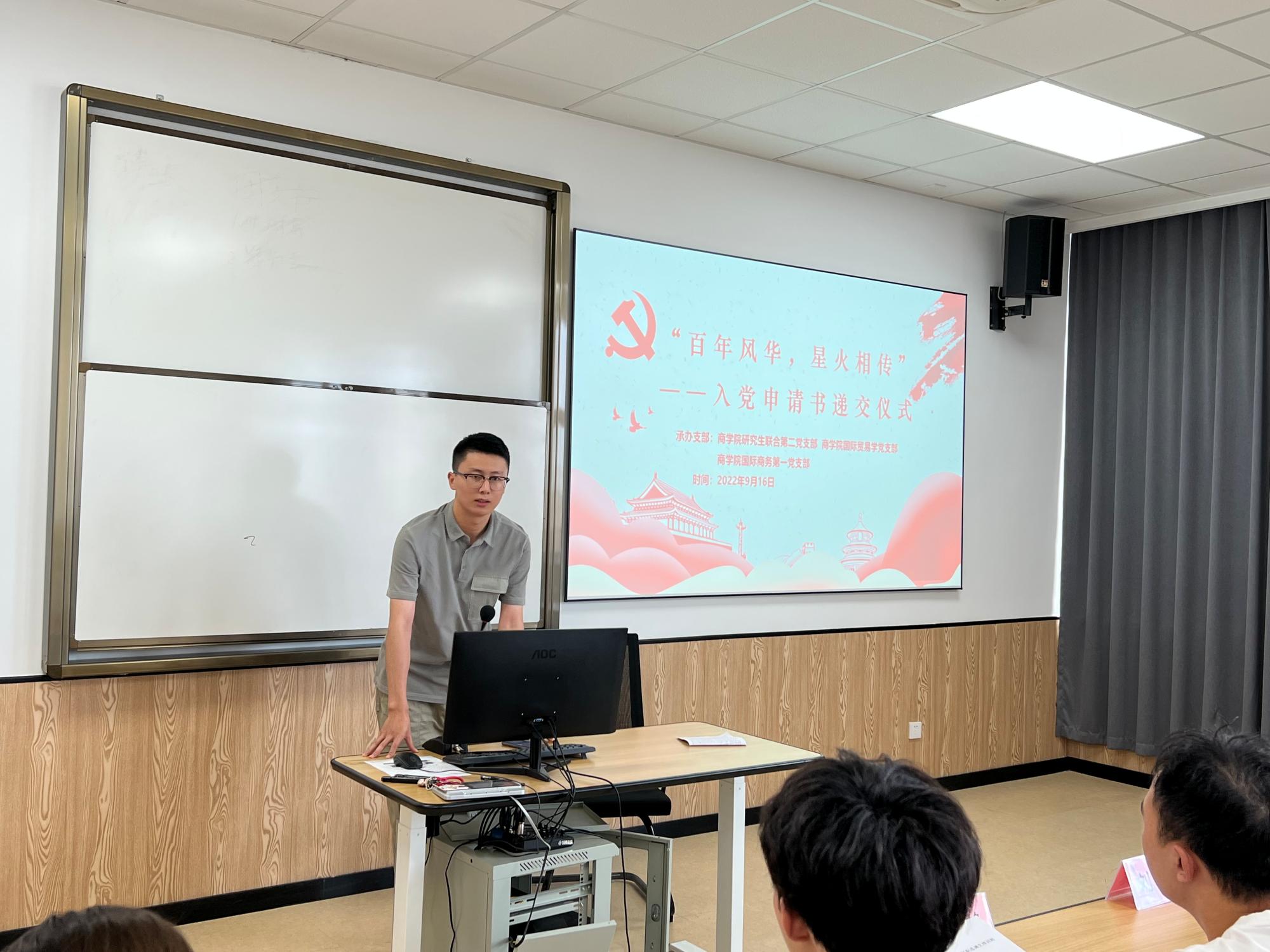 在庄严的国际歌中,2022级研究生新生依次上前,向支部书记和辅导员陶含怡递交入党申请书。