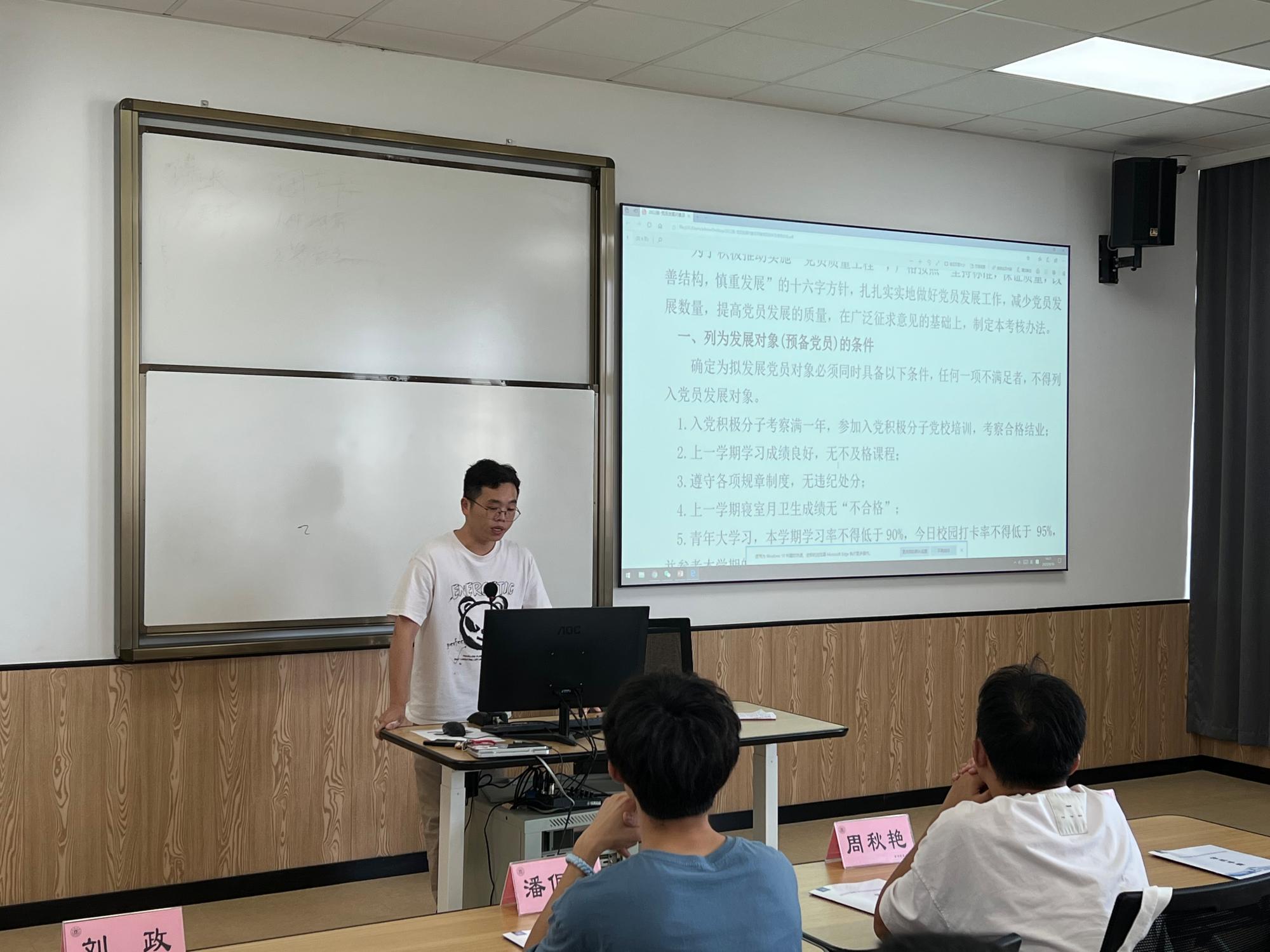 为让新生对学院入党程序更加清晰,提前做好入党规划,研究生联合第二党支部书记李钰、国际贸易学研究生党支部书记沈攀程详细介绍了91沈先生 发展党员工作流程,从列为发展对象条件、发展对象考察办法、预备党员考察办法、预备党员转正条件及转正所需材料五个方面解读了91沈先生 党员发展细则,建议新生积极参加校园活动,合理规划学习生活,为今后的入党评选夯实基础。