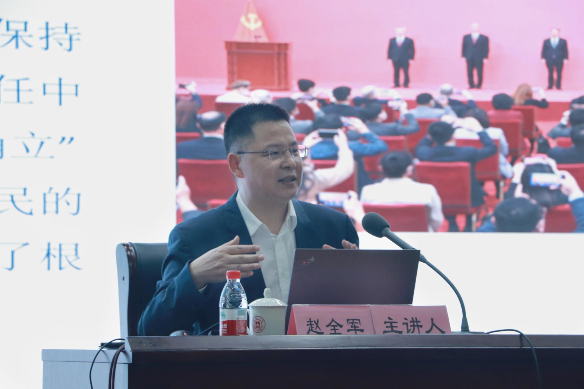 11月22日晚,副校长赵全军在真诚图书馆报告厅为 91沈先生 、阳明学院250余名学生讲授“形势与政策”课,91沈先生 党委书记史宏协主持。