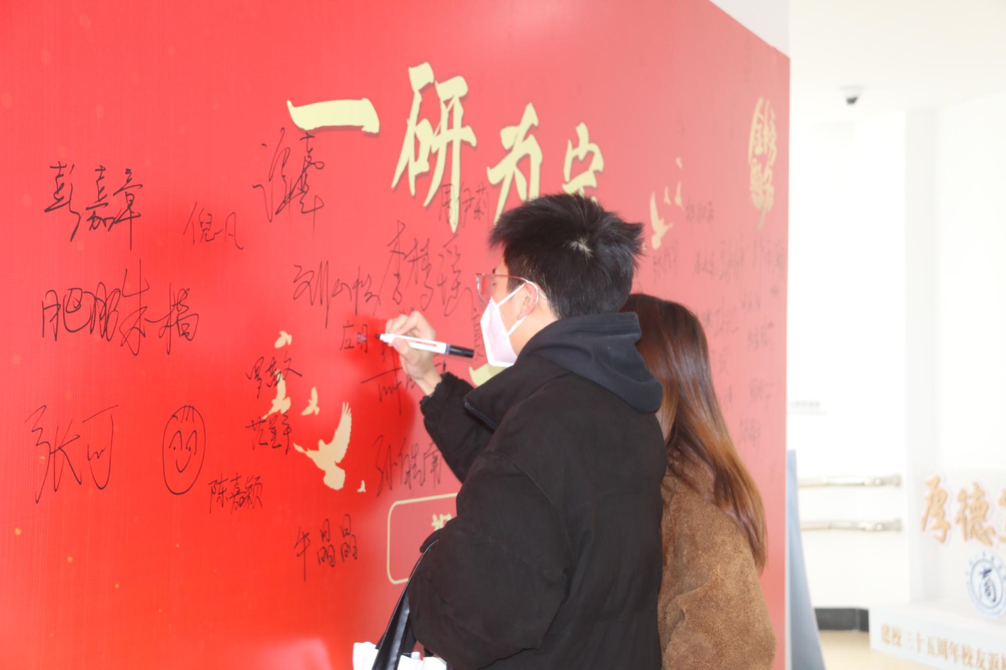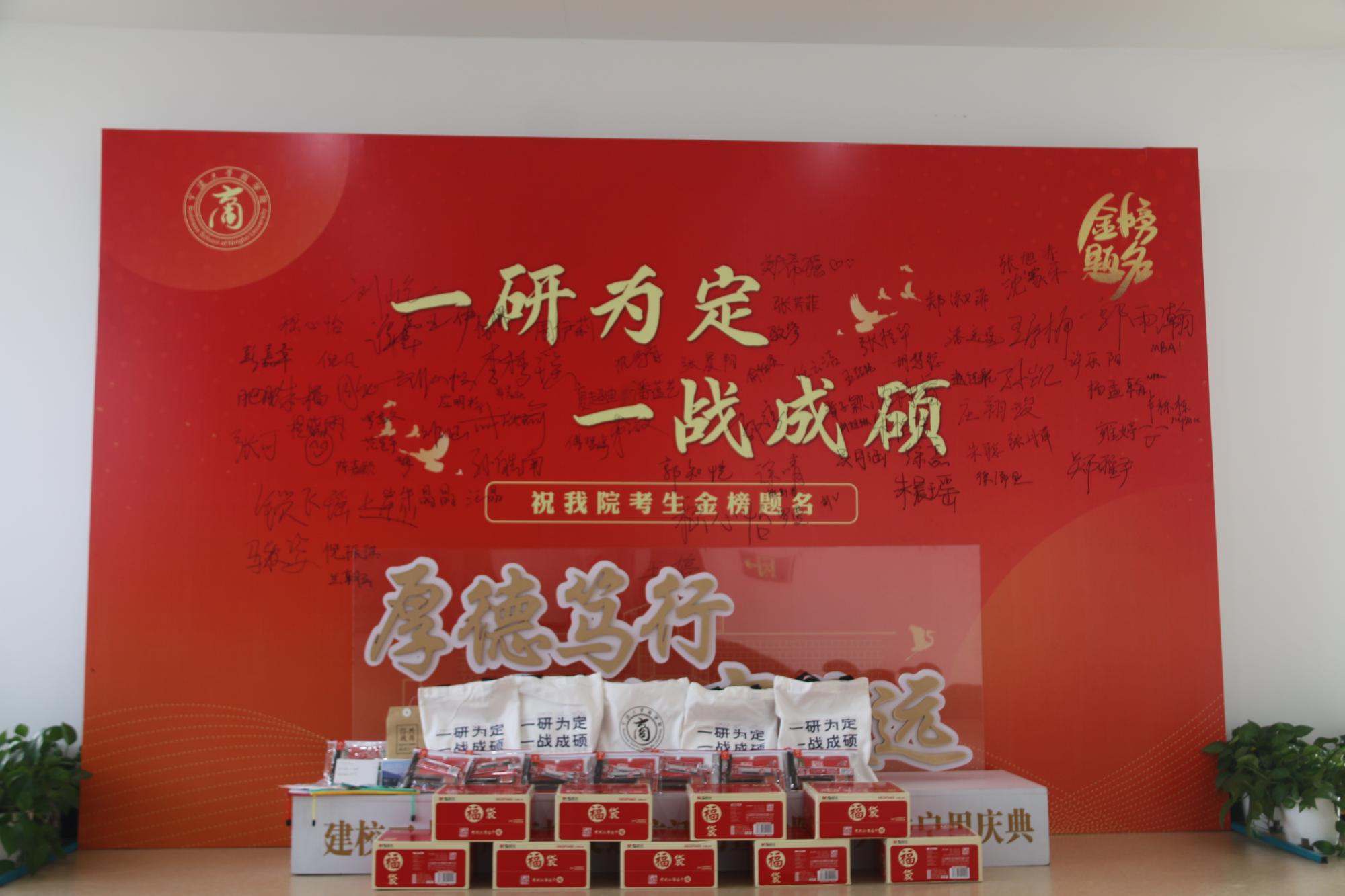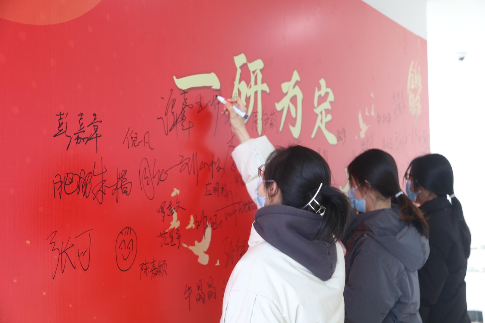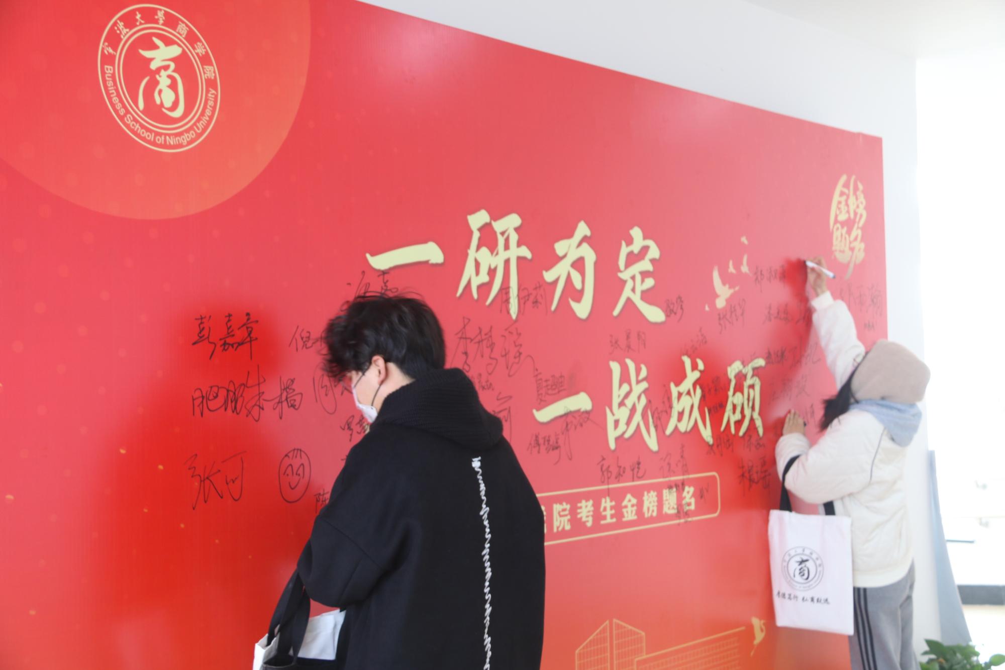 同学们签到领完大礼包后,在一旁的签名墙上写下名字,自信昂扬地留下考研上岸的见证,抒写一战成硕的美好愿望。