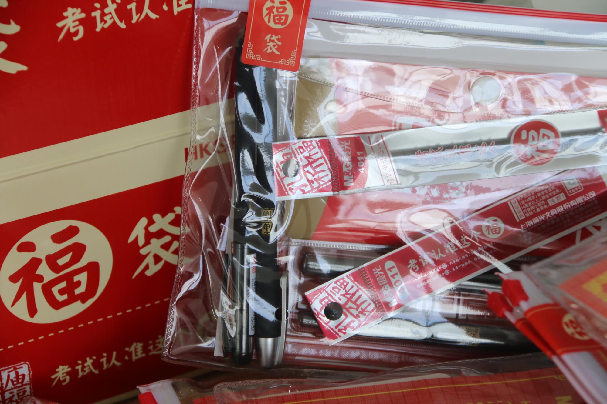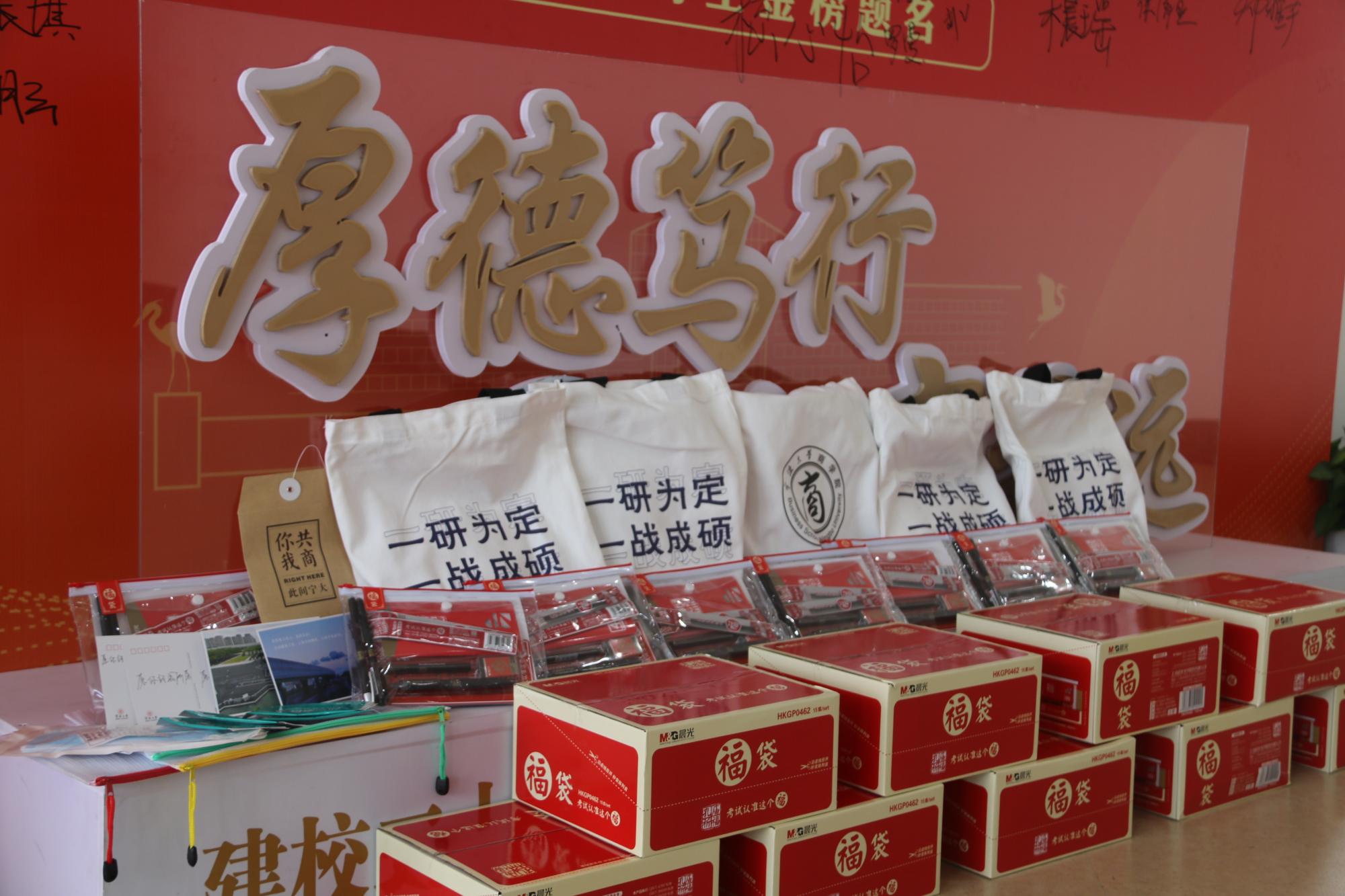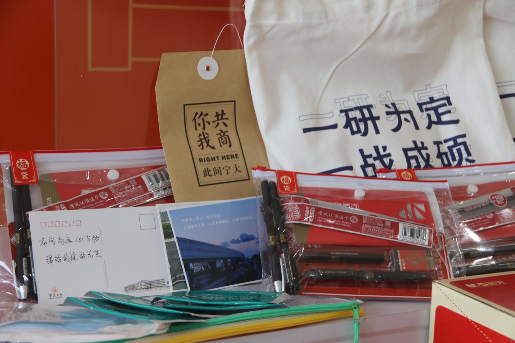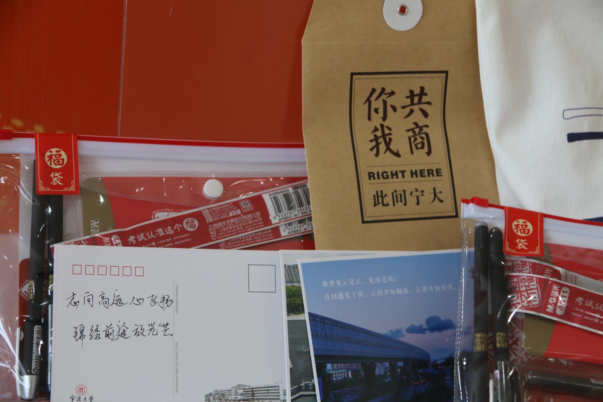 大礼包中包括考试文具套装、消毒湿巾、一次性口罩和学院特别定制设计的帆布袋。此外,学弟学妹们亲手书写的明信片,满含对学长学姐的真挚祝福。