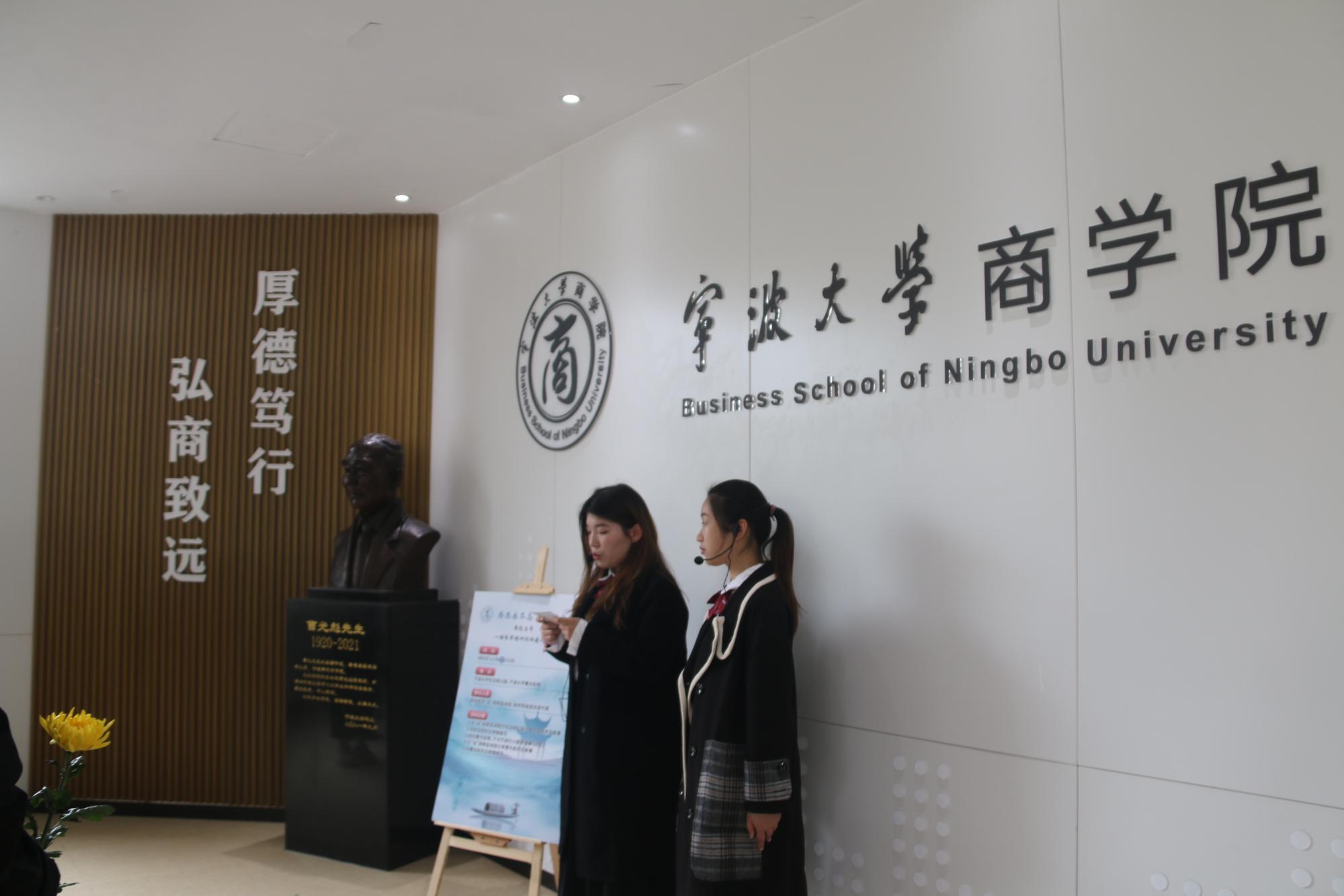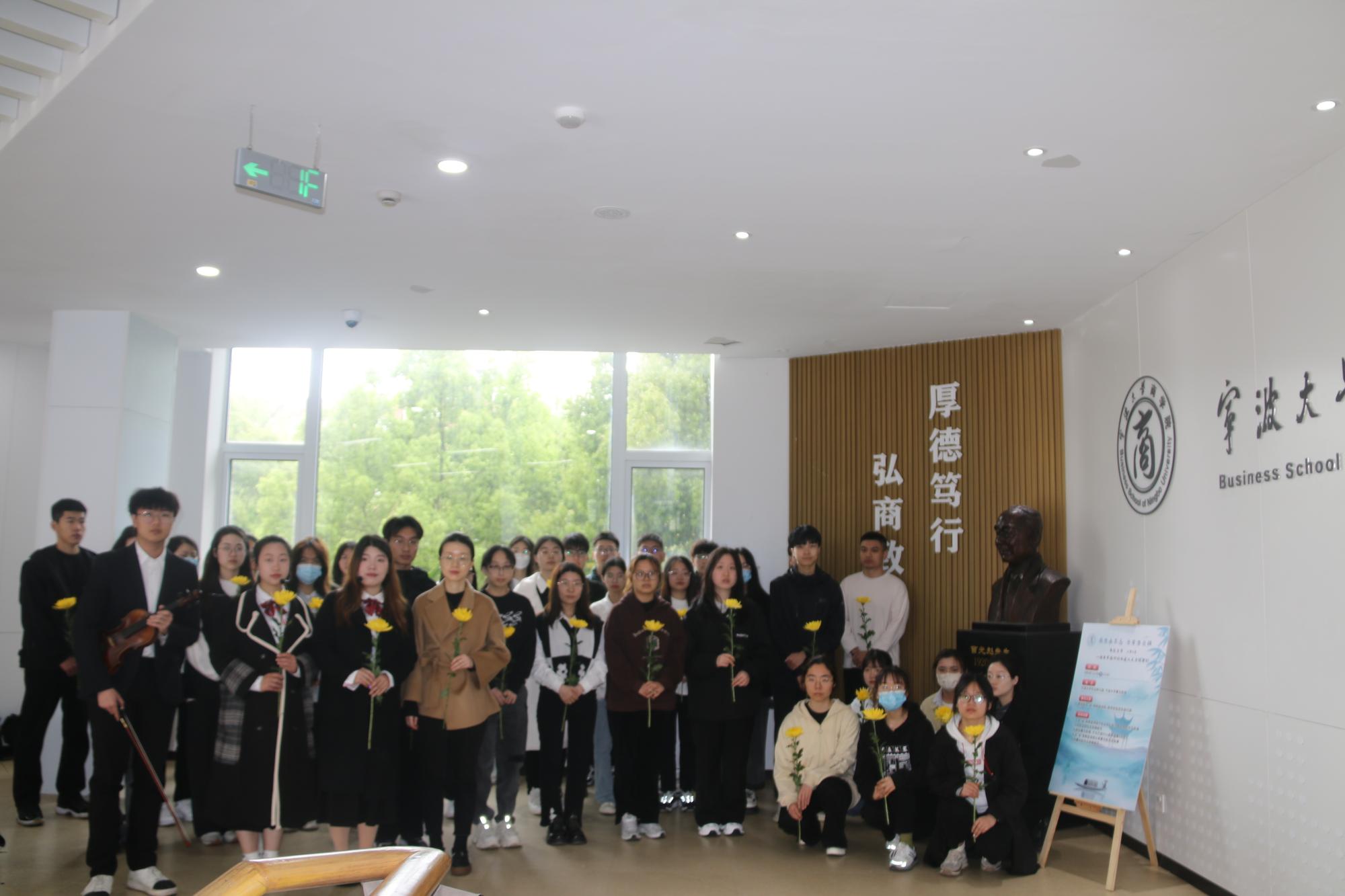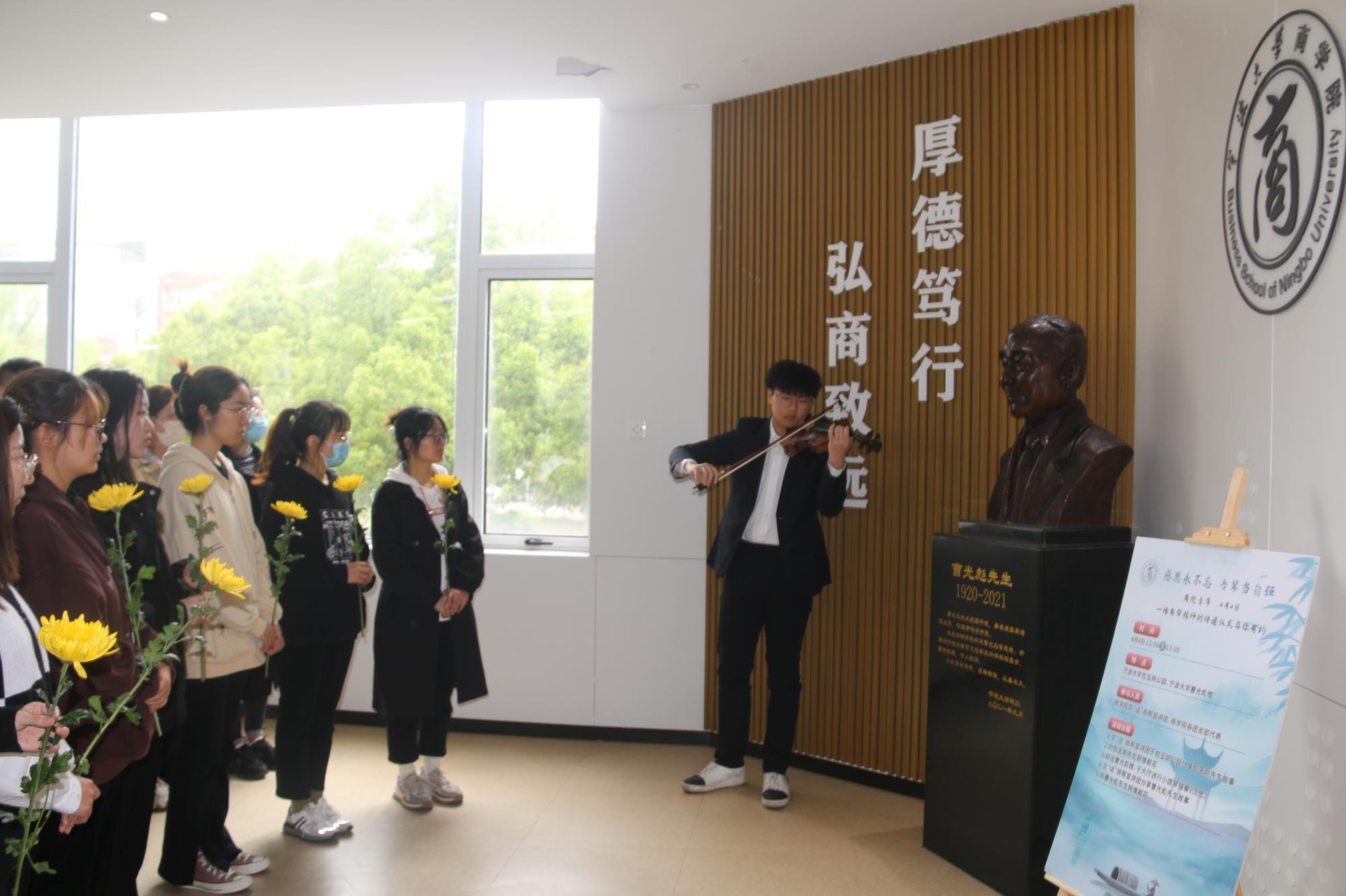 随后,一行人前往曹光彪楼,于大厅欣赏小提琴独奏《沉思》。一曲终了,文“话”商帮宣讲团分享了曹光彪先生的故事,“桃李不言,下自成蹊,斯人已逝,星火相传。感谢曹光彪先生为91沈先生 做出的无私贡献,为我们提供更好的教育资源,我们要感谢曹光彪先生,牢记宁波帮人士的付出,学习弘扬宁波帮精神”。宣讲团成员胡馨尹的话语久久萦绕在同学们耳边。仪式现场,同学们有序地在曹光彪先生铜像前献上献花。