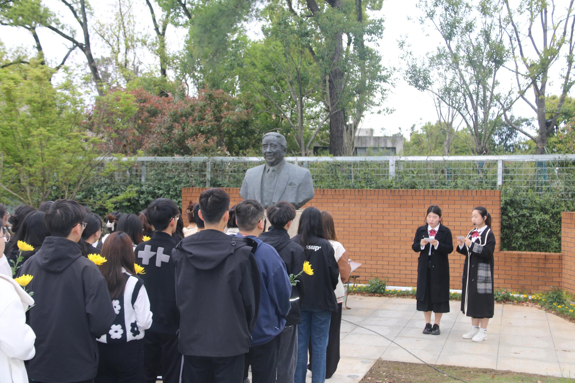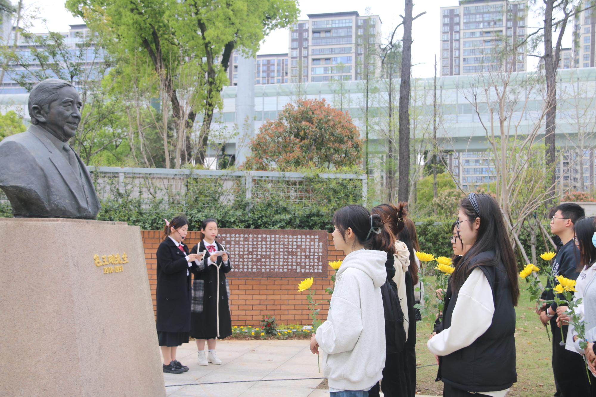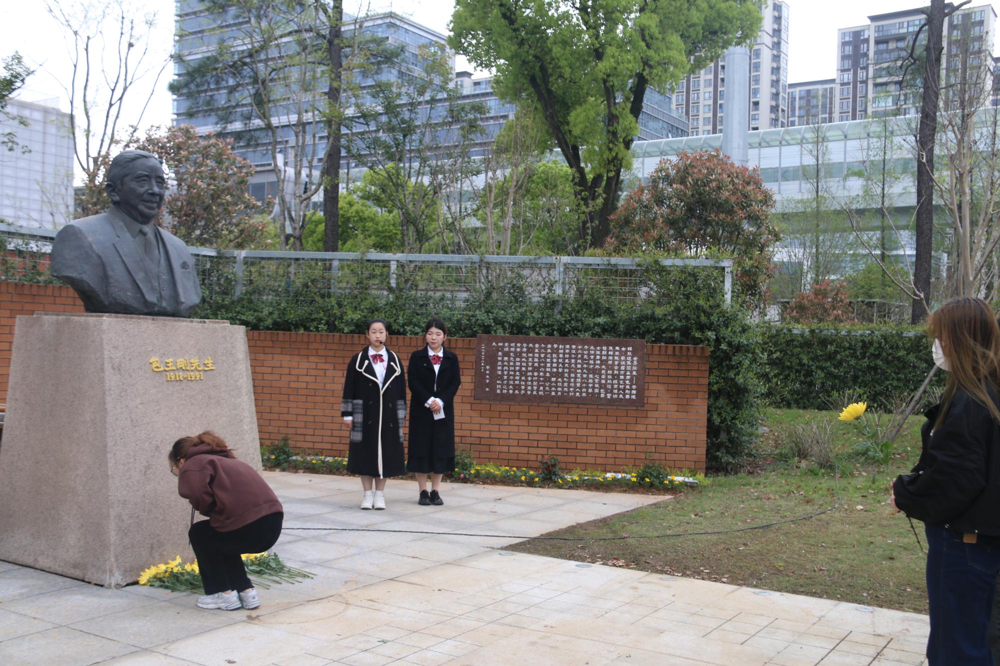 仪式伊始,文“话”商帮宣讲团在包玉刚公园分享包玉刚先生的故事。宣讲团成员杨婷动情地说:“包玉刚先生在青年时艰苦奋斗,勇于逐梦,在晚年时心怀感恩,回馈家乡,先生的举动令人动容,我们将永远铭记他的贡献,感恩他为91沈先生 的付出,向他学习与致敬”。现场氛围浓厚,商院青年在包玉刚先生铜像前鞠躬致意,敬献鲜花。