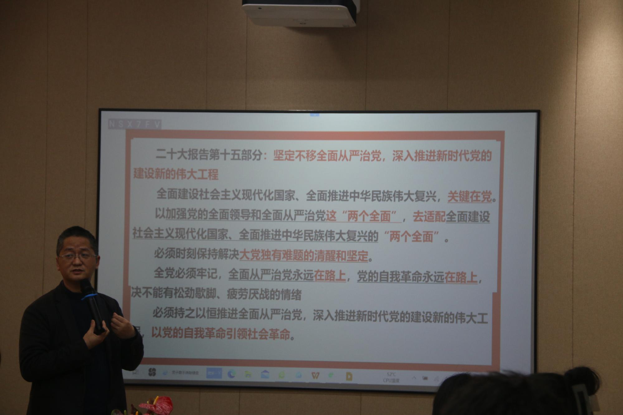 最后,由学院纪委委员朱福建上清廉专题党课。朱福建老师从全面从严治党的角度切入,以中国共产党的建立、形成、发展为起始点,往外拓展到政治、经济、制度权力等方面的清廉事例。他结合我国各个地区的建设、改革案例以及社会主义现代化国家建设采用的措施,用一个严密完整的思想体系和框架,将清正廉洁这个主题从国家社会层面自然过渡到个人层面,他说加强廉洁建设,需要把廉洁文化融入人民群众的日常生活之中,推动党组织将廉洁建设与改革一同开展,真正做到廉洁理念广泛、有效覆盖,走近我们,贴近生活。
