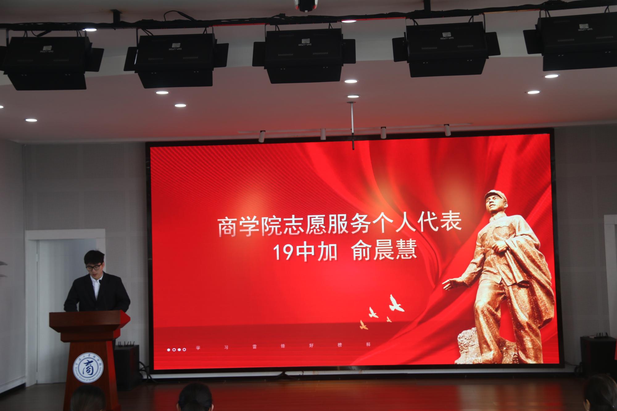 随后,学院优秀志愿者团队以“我们这样学雷锋”为主题,分享了目前在开展的助农扶农、税收志愿服务、防诈志愿服务,志愿者团队的主讲人们欢迎同学们加入志愿团队,一起进社区、进校园、进企业、进乡村,用青春志愿行动为社会主义建设贡献力量。来自本科生第二党支部的俞晨慧则分享了自己大学四年373.5个小时的各种志愿服务经历,在讲到自己参加全运会、核酸检测志愿者的经历时,他说志愿服务充满了挑战和辛苦,但收获了自信和成长,他鼓舞在场的同学们:“加入志愿者服务队伍,用向上的力量和火红的初心、注满感恩,服务人民,在新时代新征程的道路上跃动青年积极向上的时代脉搏。”