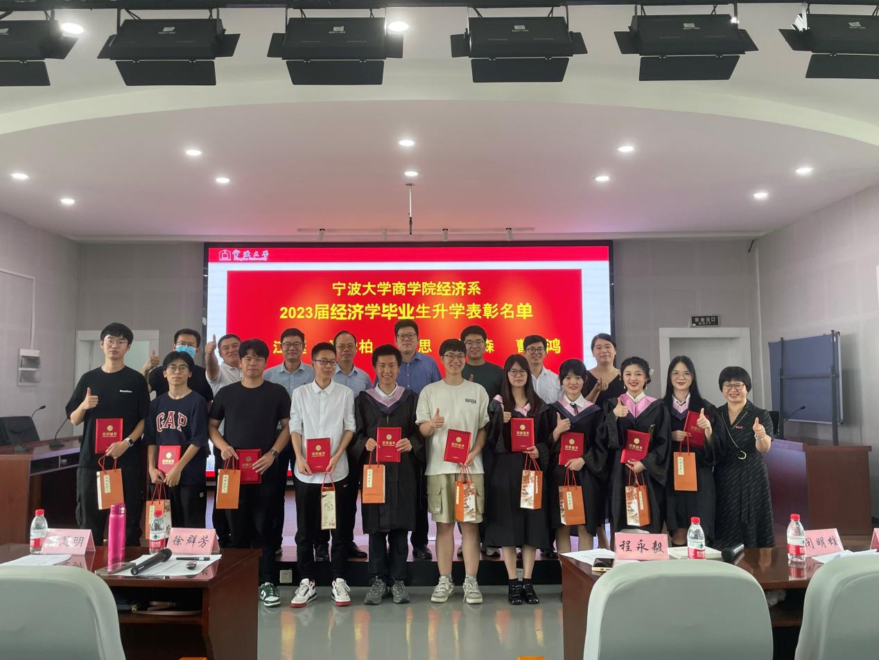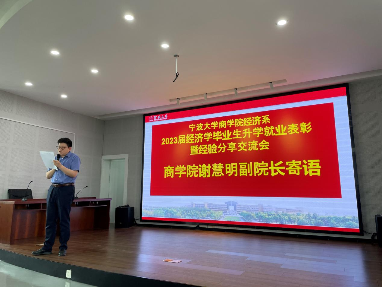 经济系主任徐群芳首先祝福2019级学生顺利毕业,并指出了本次表彰和交流会的重要性。谢慧明副院长对各位继续深造和就业的毕业班学生表示祝贺,并结合当前中国经济发展的形势,寄语各位同学出校门后要继续努力培养自己,使自己成为对社会有用的创新型人才。2023届经济学班主任程永毅老师、辅导员章舒怡老师分别对毕业班同学寄语,希望各位同学能够有更好的前程,也希望各位同学能够在毕业后常回母校看看,多多与老师们交流。致辞完毕后,谢老师与经济系其他老师共同对各位升学毕业生以及省级优秀毕业生进行表彰。