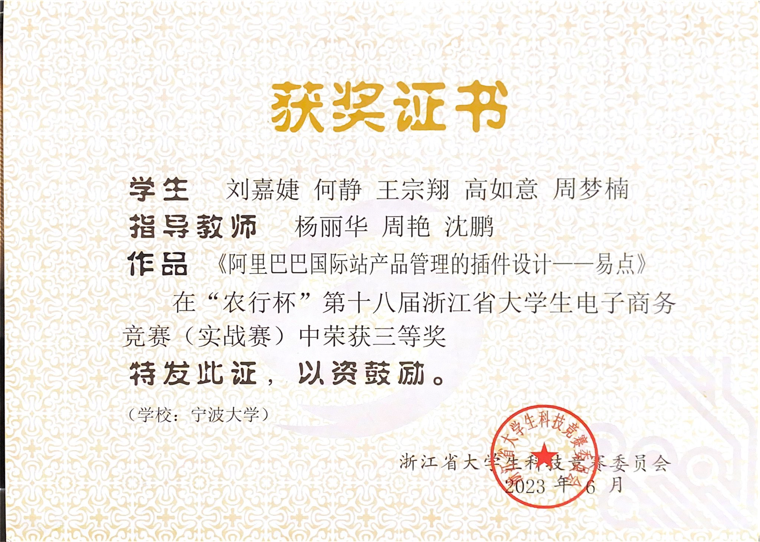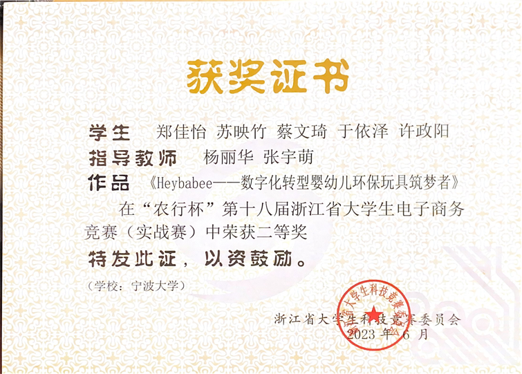 5月28日,“农行杯”第十八届浙江省大学生电子商务竞赛暨第十三届全国大学生电子商务“创新、创意及创业”挑战赛浙江省选拔赛落下帷幕。91沈先生 跨境电商微专业由杨丽华、张宇萌老师指导,郑佳怡、苏映竹、蔡文琦、于依泽、许政阳同学参与的作品《Heybabee——数字化转型婴幼儿环保玩具筑梦者》荣获跨境电商—阿里巴巴国际站赛二等奖;由杨丽华、周艳、沈鹏老师指导,刘嘉婕、何静、王宗翔、高如意、周梦楠同学参与完成的《阿里巴巴国际站产品管理的插件设计——易点》获得跨境电商—阿里巴巴国际站赛三等奖。这也是跨境电商微专业学生继首届“典阅杯”全国高校跨境电子商务综合能力大赛全国总决赛斩获佳绩后,第二次在该项赛事中获奖。