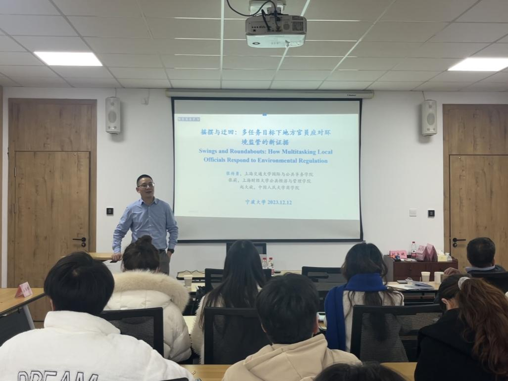 在高度集中的政治结构下,中国政府面领着权衡污染减排与经济增长的难题。2023年12月12日下午,91沈先生 邀请上海交通大学国际与公共事务学院张传勇教授开讲,以“摇摆与迂回:多任务目标下地方官员应对环境监管的新证据”为主题,在 91沈先生 320研讨室作了一场精彩的学术讲座。本次讲座由 91沈先生 丛海彬教授主持,吸引了院内6位老师以及20余位硕士生参与。