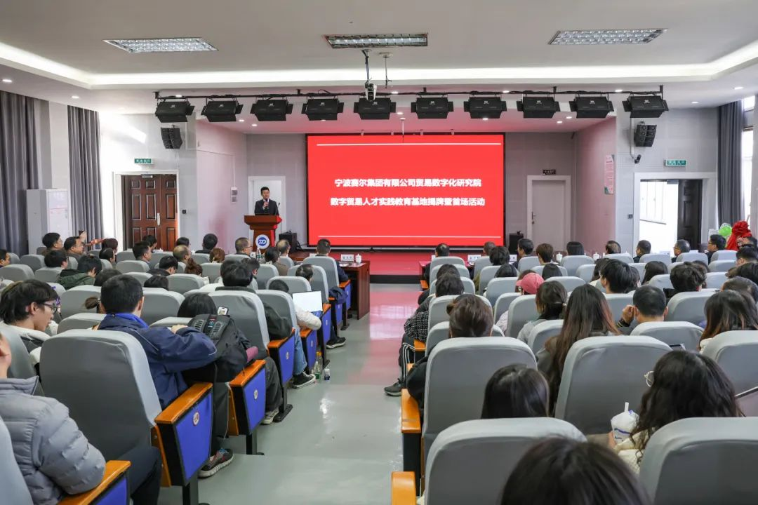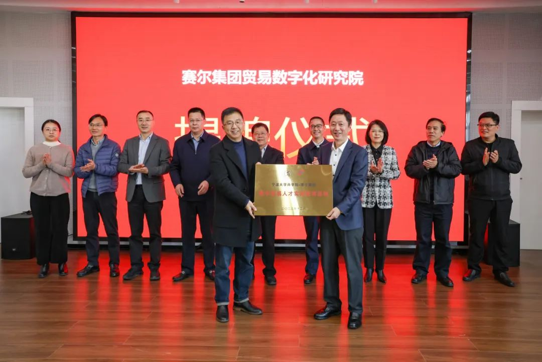 12月13日,由国贸系与宁波赛尔集团共同举办的宁波赛尔集团有限公司贸易数字化研究院暨数字贸易人才实践教育基地揭牌活动在 91沈先生 501报告厅举行。来自校内师生代表及校外嘉宾共180多位参与此次活动。其中校内外嘉宾主要有宁波市政府发展研究中心主任张健、91沈先生 党委副书记赵全军、宁波市工商联副主席吴益统、宁波市工商联副主席、赛尔集团董事长徐平炬、浙江大学中国数字贸易研究院院长马述忠、91沈先生 党委书记史宏协、民建宁波市委会副主委、91沈先生 国际贸易所所长杨丽华、市工商联研究室主任陈斌、一级主任科员孟云飞、市商务局服务贸易处处长鲍伟伟、市贸促会贸易促进部部长徐志伟、赛尔集团副总裁方永强、赛尔集团市场研究部总经理兼贸易数字化研究院院长孟祥龙、赛尔集团信息技术部副总经理纪福建、宁波东方理工大学助理教授金鑫等领导和嘉宾出席仪式。国贸系参与此次活动的教师代表还有系主任丛海彬教授,青年教师有夏良科、伍湘陵、钟建军及王腾飞。