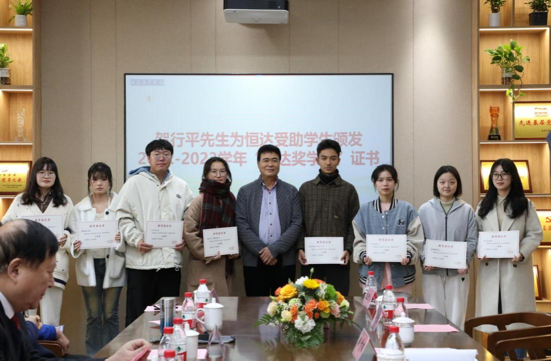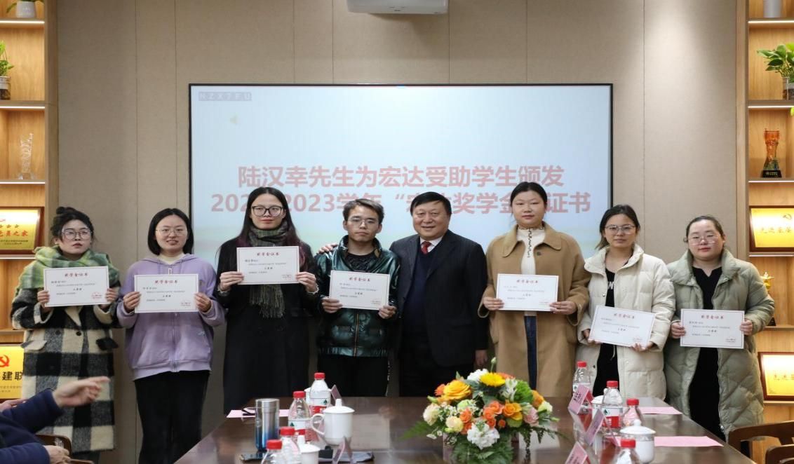 会议开始,主持人介绍出席仪式的领导和嘉宾,通过短片回顾了陆董、贺董和赞助学生的点点滴滴,并介绍91沈先生 “宏达奖助学金”“恒达奖助学金”项目概况。由学生发展与服务处副处长朱燕宣读2022-2023学年“宏达奖学金”“恒达奖学金”获奖名单,陆汉幸先生、贺行平先生为在场获奖学生颁发“宏达奖学金”“恒达奖学金”证书。