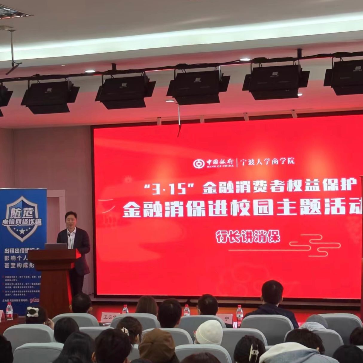 为更好地普及金融知识,切实帮助高校大学生掌握必备的金融知识和技能,提升风险防范意识和自我保护能力,3月13日下午,“金融消保进校园”反诈知识讲座在91沈先生 501报告厅顺利进行。本次讲座邀请中国银行江北支行行长、党委书记王云伟作为主讲人,学院党委书记史宏协、副书记韩雯琛出席,9名银行一线工作人员到场。