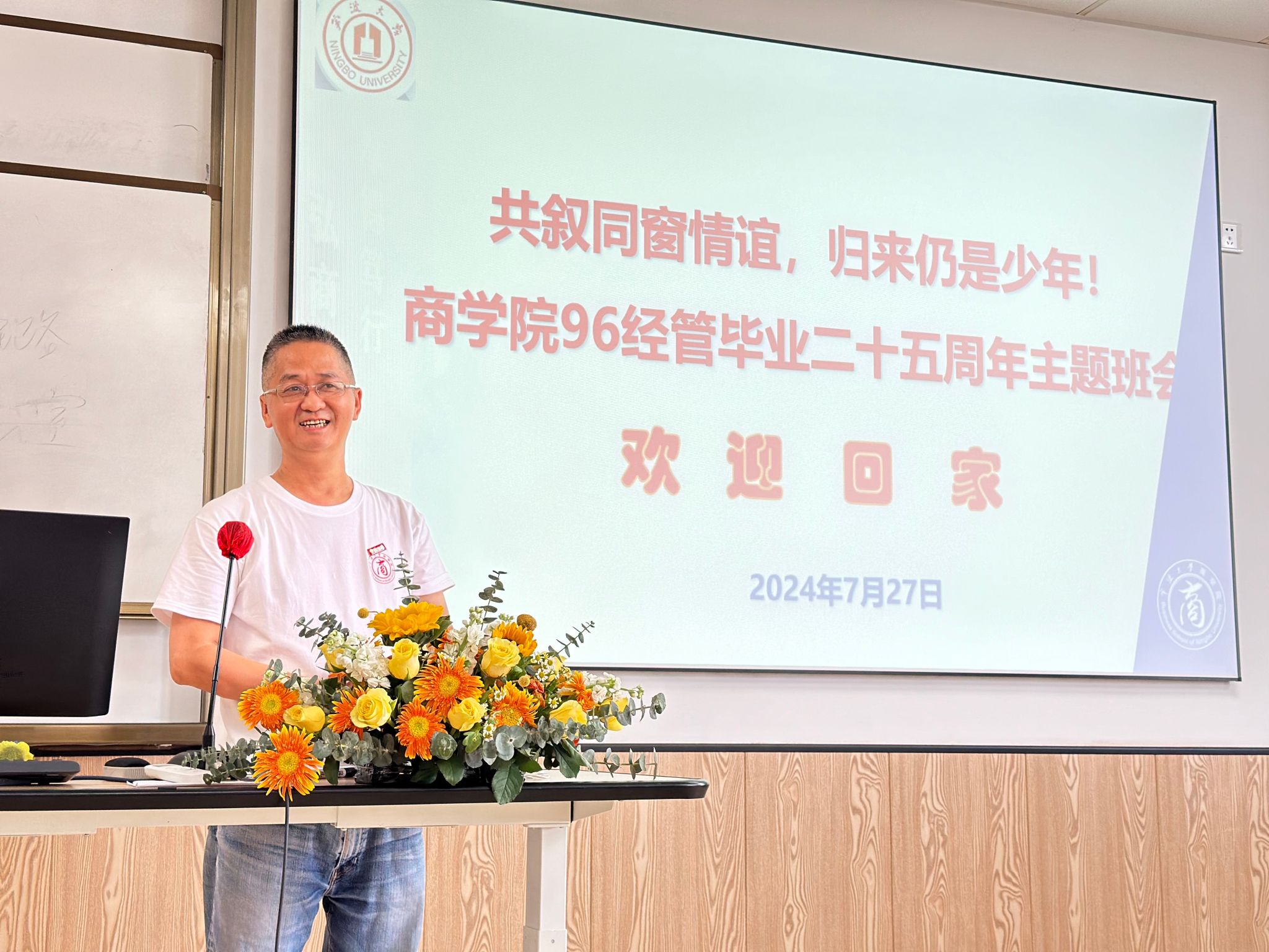 下午一点,从全省各地赶来的校友们相聚在学院422教室举行毕业二十五周年主题班会。班会伊始,现场播放了朱老师制作的一分钟视频《青春回忆——宁大96经管班》,把校友们的记忆带回到二十五年前的大学校园。视频播放后,朱老师按照学号给校友们进行点名,并给每位校友佩戴91沈先生 校徽。朱老师用PPT形式现场介绍母校母院二十多年来的巨大变化。96经管班校友们依次上台讲述大学期间的美好回忆,向母校汇报各自工作、家庭现状。值得欣慰的是,毕业二十五年后,班级每一位校友身体很健康、工作很顺利、家庭很幸福。校友们纷纷表示,91沈先生 的几年学习,塑造了自己的人生观、价值观、世界观,尤其是老师们的谆谆教导,对他们的工作生活助益良多。班会的最后环节由朱老师给校友们上了一堂《宁大版的增广贤文——大学人生12条箴言》。朱老师风趣幽默的语言活跃了课堂气氛,一下子把校友们拉回到二十五年前的求学时光。