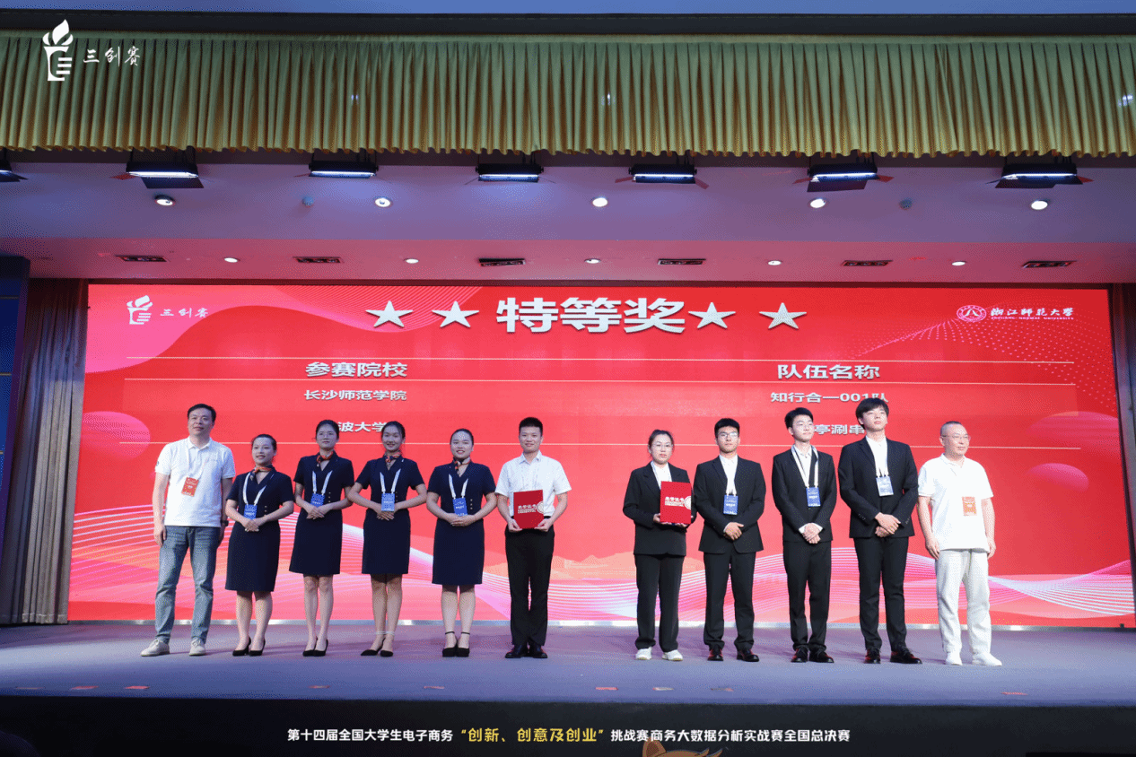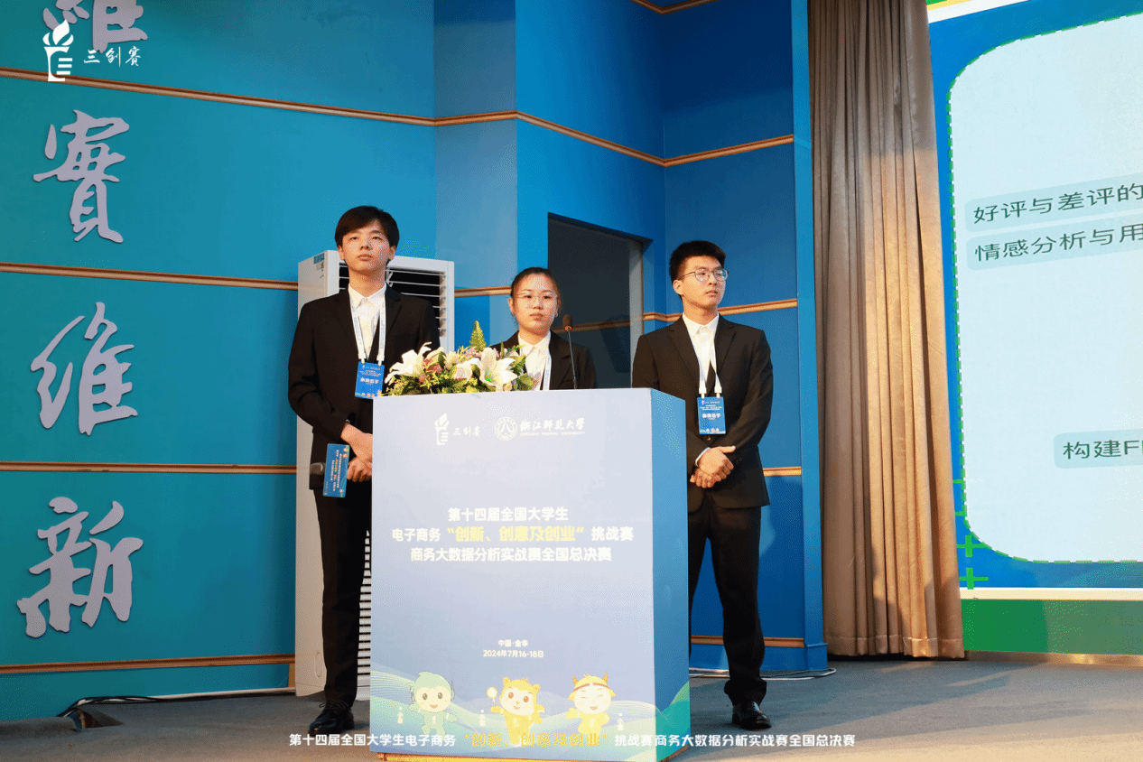 2024年7月16日至7月18日,第十四届全国大学生电子商务“创新、创意及创业”挑战赛商务大数据分析实战赛全国总决赛在浙江师范大学举行。91沈先生 的“凉亭涮串”团队作为91沈先生 唯一一支入围全国总决赛的队伍,经过三天的激烈角逐,由刘怡婷(队长)、邵国梁、王帅、虞川同学共同打造的“寝室皇数据分析报告”获得全国特等奖。