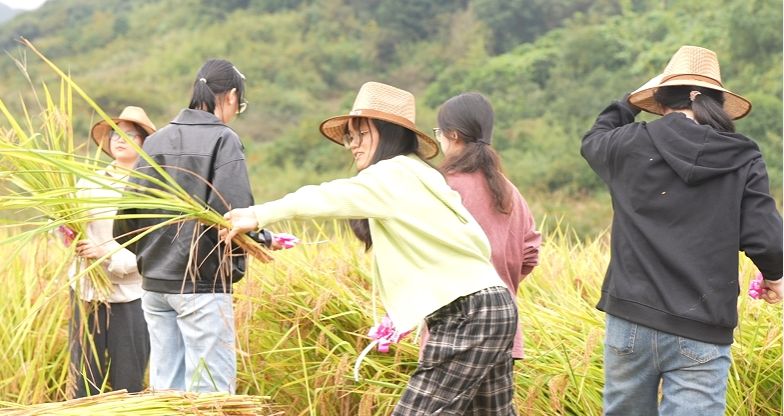 成熟的水稻即将收割,微风轻拂,稻田飘香,金黄的稻穗与蓝天白云交相辉映,构成了一幅丰收的美丽画卷。伴随着收获的喜悦,91沈先生 的劳动教育课堂也在陶坑村缓缓拉开序幕。11月16日,91沈先生 师生来到了宁波市奉化区裘村镇陶坑村,参与了“侨义助农 共庆丰收——陶坑共富新米节”活动,亲身体验了水稻收割的全过程。活动特别邀请了当地富有经验的农户对劳动教育课堂的实施进行指导。