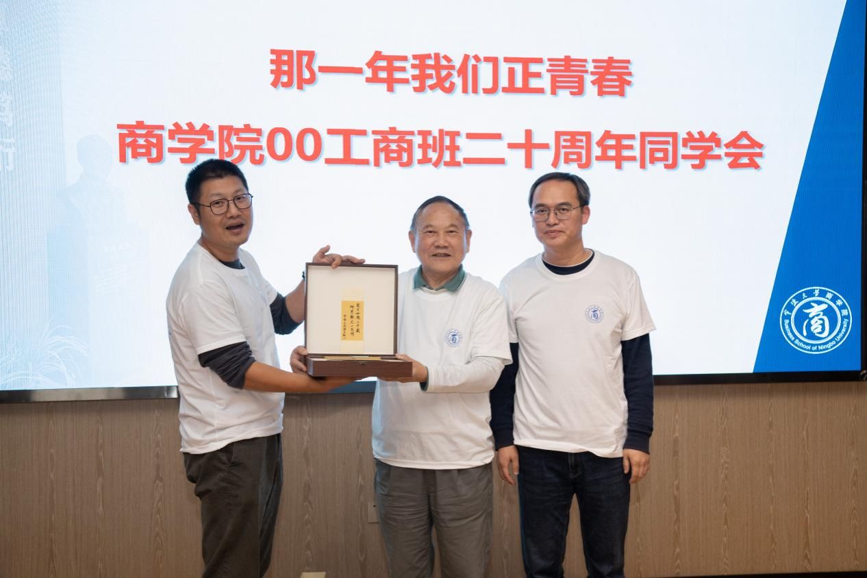 主题班会上,周光华首先致辞。他指出,同学情,战友情,是两张最亲的“情名片”,一别二十年,相聚不容易。他对全体同学提出来四点殷切期望:一是要有家国情怀、二是要终生读书、三是关爱孩子的成长、四是做事要坚持。拳拳爱心、殷殷嘱托,令校友们感到师恩一如二十年前一般热辣滚烫。随后校友代表向老师们赠送了纪念品,感谢两位老师四年的辛勤培育和一直以来的关心厚爱,岁月如梭二十载,师恩难忘一生情。朱福建用PPT形式全面介绍了 91沈先生 二十年来的巨大变化以及取得的丰硕成果。校友们依次上台交流,追忆四载似水年华,青葱往事点点滴滴,恍如昨日;述说走出校门走向社会的奋斗历程,勇毅前行,成家立业,满天星斗,各放异彩。校友们纷纷表示,四年大学生活,在“经世致用、实事求是”校训的引导下,在老师们的精心指导下,大家在宁大增进了学业、收获了友情,实现了人生蜕变,滋养了此后的漫漫人生旅程。