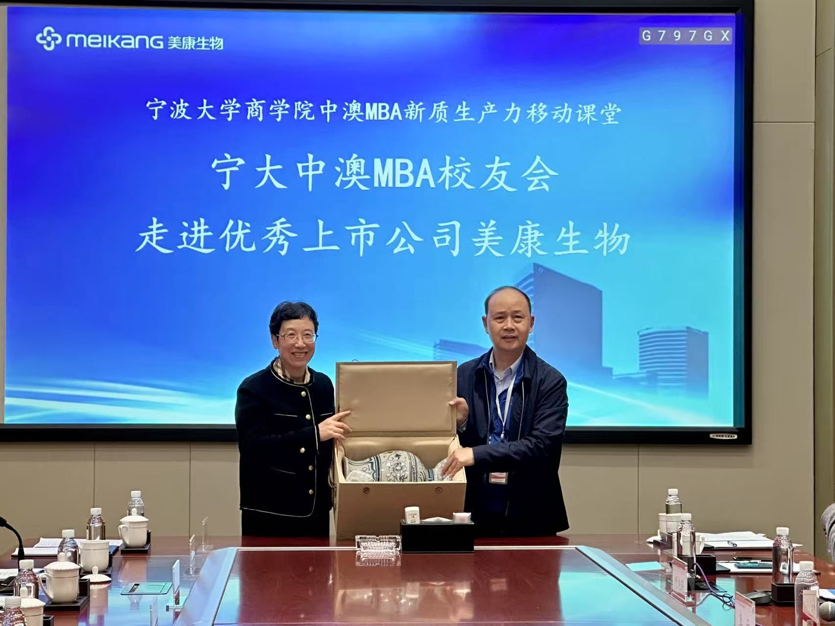 交流结束后,彭新敏副院长代表91沈先生 ,邱妘教授代表91沈先生 中澳MBA校友会分别向美康生物送上了精心准备的感谢礼品。全体参会人员在公司一楼大厅内进行了合影留念,为此次活动留下了珍贵的记忆。
