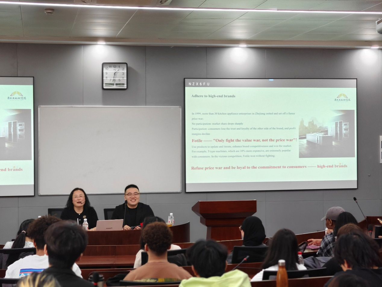 刘达于2010年毕业于91沈先生 工商管理系,现就职于方太文化研究院,担任副院长。讲座伊始,刘达动情回顾了在 91沈先生 学习的点点滴滴,感恩母校培养和院系老师的栽培鼓励,作为学长给予在座同学们诸多建议和鼓励。接着,刘达以方太集团发展历程为主线,回溯企业从“飞翔集团”二次创业至今的蜕变。他重点阐释了方太坚守高端定位、拒绝价格战与短期利益的战略选择,方太通过“美善创新”“以心为本”等核心理念,打造出兼具科技实力与文化底蕴的品牌。数据显示,方太坚持每年投入超5%营收用于研发,累计专利达1.2万项,2017年营收突破百亿,2022年逆势增长至162亿。此外,刘达分享了方太以中华优秀文化为核心的管理实践,如全员身股制、NPS服务系统、“五个一”修身计划,强调“文化自信是中国企业立足全球的根基”。讲座现场,中外学子就跨文化管理、企业社会责任等话题展开互动交流,同学们在了解到方太一以贯之的高端品牌建设思路、结合中西文化的管理思想后收益颇多,并提出了诸多颇有见地的问题。