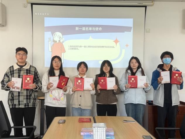 本次大会的核心环节——新一届成员聘任仪式隆重举行。宋欣格为当选的新一届主席团成员及各部门负责人颁发了聘书及纪念品。一份份聘书象征着信任与责任,一份份纪念品代表着认可与接纳,接过聘书和纪念品的同学们表情庄重,眼神坚定。全体新成员合影留念,标志着 91沈先生 心理协会新征程的正式启航。