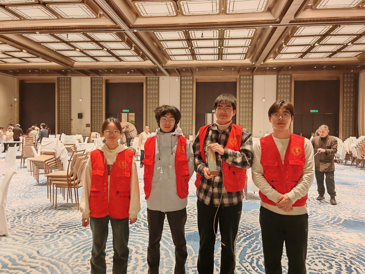 幕后台前,无声奉献有余温。晚宴启幕之时,志愿者们的忙碌仍未停歇。身着红马甲的他们穿梭于会场与后台之间,小心翼翼地搬运舞台布景、颁奖道具,根据晚宴流程精准调整道具摆放位置,确保舞台呈现的每一处细节都尽善尽美;兑奖区域的志愿者则守在岗位上,仔细核对嘉宾的兑奖凭证,快速找寻对应奖品,耐心解答兑奖疑问,即便现场人流熙攘,兑奖环节依旧有条不紊。这些红衣身影始终立于光影之外,汗水将衣衫浸透成深色,热忱却不曾减却一分。他们如同静默的基石,以无声的支撑,托举起晚宴每一环节的流畅运转,将琐碎与繁重化解为秩序与从容。