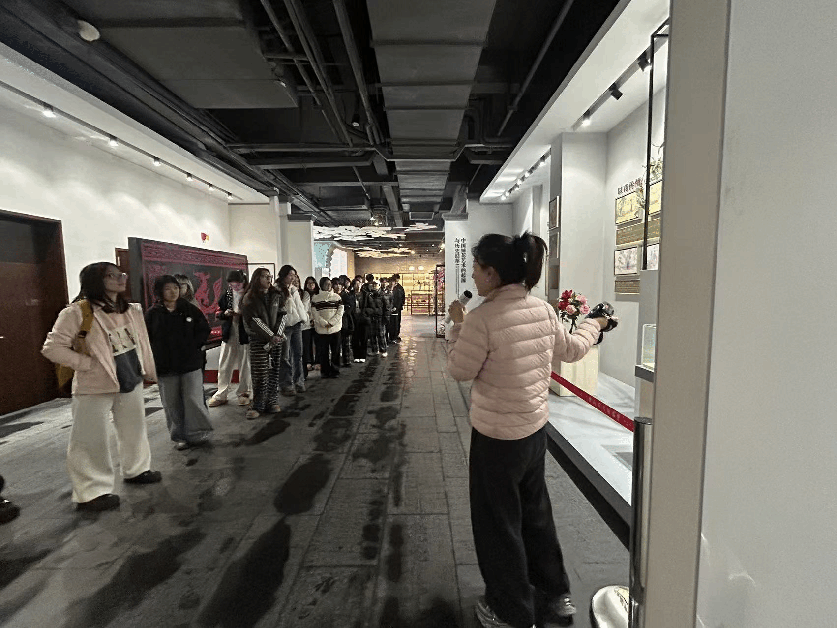 在陈慕榕馆长的引导下,师生一行首先步入中国插花艺术博物馆,这里的每一处展陈都承载着花艺文化的传承与创新,更暗藏着企业组织文化落地的巧思。讲解员详细梳理了插花艺术的历史渊源,从古代文人雅士的案头清供到当代生活美学的多元表达,生动诠释了传统插花、现代插花与现代花艺三大类别的风格特质与文化内涵。馆内精心打造的传统插花生活体验区、中国现代插花生活体验区与中国现代花艺生活体验区,以场景化还原的方式,将不同花艺形式融入家居、茶饮、办公等日常场景,让学生直观感受花艺在空间氛围营造中的点睛之效,更深刻体悟到蓝海绿业集团如何通过文化场景构建,传递企业核心价值观、凝聚组织共识的组织行为学实践逻辑。