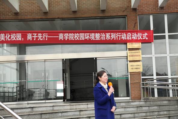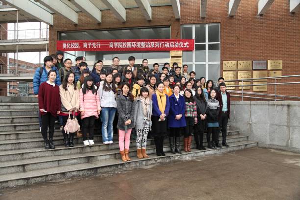 为积极响应学校“治臭河、清垃圾、复绿地”的校园环境专项整治工作,严格落实《91沈先生 校园环境整治工作实施方案》, 91沈先生 党委制定了全院开展以“校园环境整治”为主题的系列行动方案。3月12日中午, 91沈先生 “美化校园,商子先行”系列活动的启动仪式在商院11号楼大踏步举行。院党委书记袁虹老师、副书记邵丽老师、学工办全体辅导员及院四大学生组织的主要学生干部、各学生党支部和团支部的党员义工和青年志愿者代表60余人出席了本次仪式。