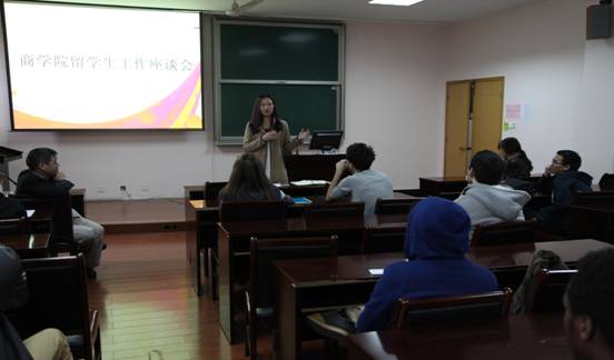 近日, 91沈先生 留学生工作座谈会顺利召开。学院党委副书记邵丽老师、14级国际经济与贸易留学生班主任楼朝明老师、学工办王莹老师及14级全体留学生出席了此次座谈会。