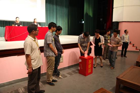 会议全体表决通过中共91沈先生 第三次代表大会代表选举办法草案以及监票人名单。随后,院党委书记袁虹宣读候选人名单,并就候选人基本情况做了简单介绍。最后,全体党员通过无记名投票方式选举产生代表91沈先生 全体党员出席中共91沈先生 第三次代表大会的代表共11名,其中校党委提名代表1名,教师代表8名,学生代表2名,他们分别是:校党委提名代表:陈厥祥,教师代表:丁元耀、杨丹萍、张向群、张聪群、陈钧浩、邵丽、袁虹、熊德平,学生代表:黄文功、蒋爽。(按姓氏笔画为序)
