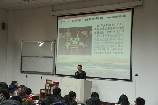 郭书记首先向同学们介绍了“占中”事件的概念及发展过程,通过大量事实和数据表明了“占中”事件对香港经济、民生、社会秩序产生的影响,揭示了此次“占中”事件是违背“一国两制”原则、挑战中央权力、漠视基本法的严重社会政治事件,是公然违反香港现行法律的非法活动。通过历史正反两方面的经验告诉我们,坚持一国两制才能铸就香港的辉煌,未来香港只有抓住中国的主旋律,抓住机遇,与祖国同呼吸,共命运才能够持续繁荣。
