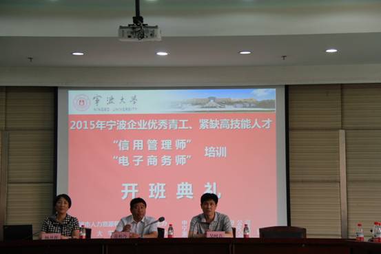 6月6日,2015年宁波市企业优秀青工“信用管理师”和紧缺高技能人才“电子商务师”两个培训项目的开班仪式在安中大楼碧华厅顺利举行。宁波市人力资源和社会保障局职业技能建设处副调研员吴时青、91沈先生 院长范柏乃、继续教育与培训处招标项目负责人鲁保富、 91沈先生 培训中心主任朱一鸿以及来自宁波各县市区的近100名学员参加了开班仪式。仪式由 91沈先生 副院长杨丹萍主持。