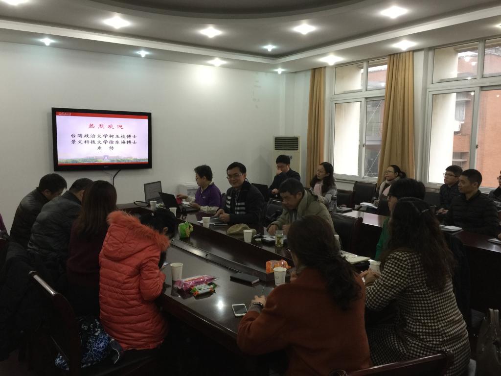 2016年1月10日下午14点, 91沈先生 “科研下午茶”2016年第1期在11#412会议室如期举行。此次沙龙的主题:“一带一路”战略与海峡两岸经贸合作,主持人:国际经济与贸易系主任邓启明教授,主讲嘉宾:台湾政治大学柯玉枝教授、景文科技大学徐东海副教授。两位专家分别进行了题为《从ECFA、TPP与RECP看未来两岸关系发展与区域经济合作》和《台湾产业转型的契机与挑战:兼谈海峡两岸经贸合作的研究方法与体会》的精彩报告,并与在场师生进行自由交流与热烈互动。